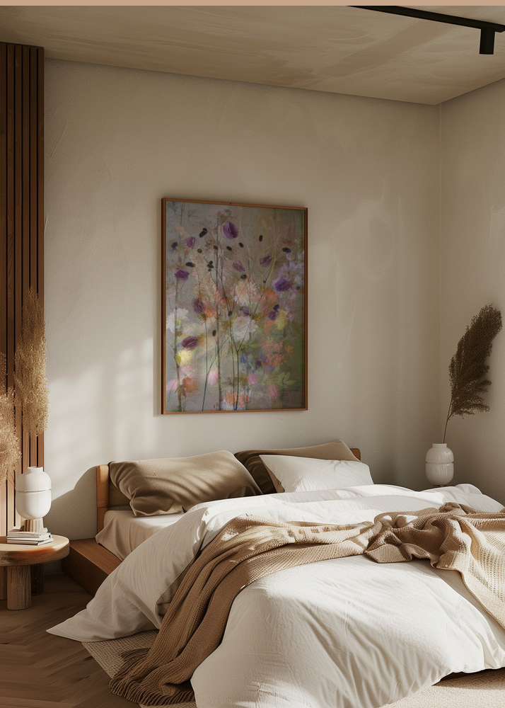 An amazing hand-painted print of purple and white dried flowers. Set on a beige coloured background, the natural colours of the flowers create a relaxing atmosphere. The soft greens, purples and orange tones are very gentle on the eye. A beautiful print to hang next to your dressing table.
