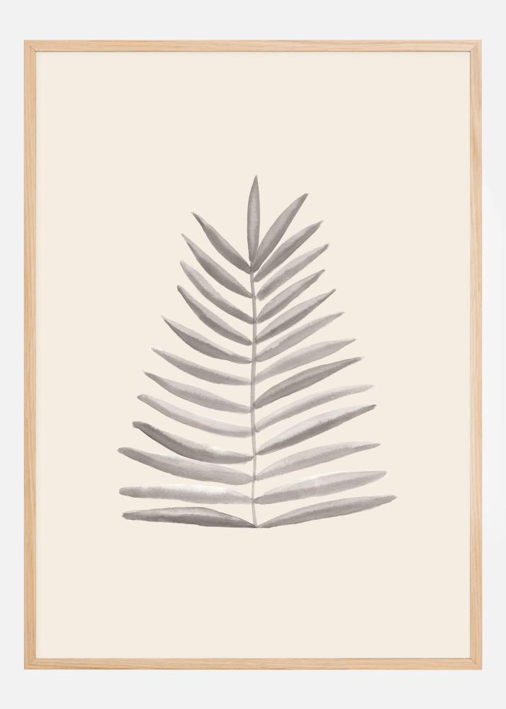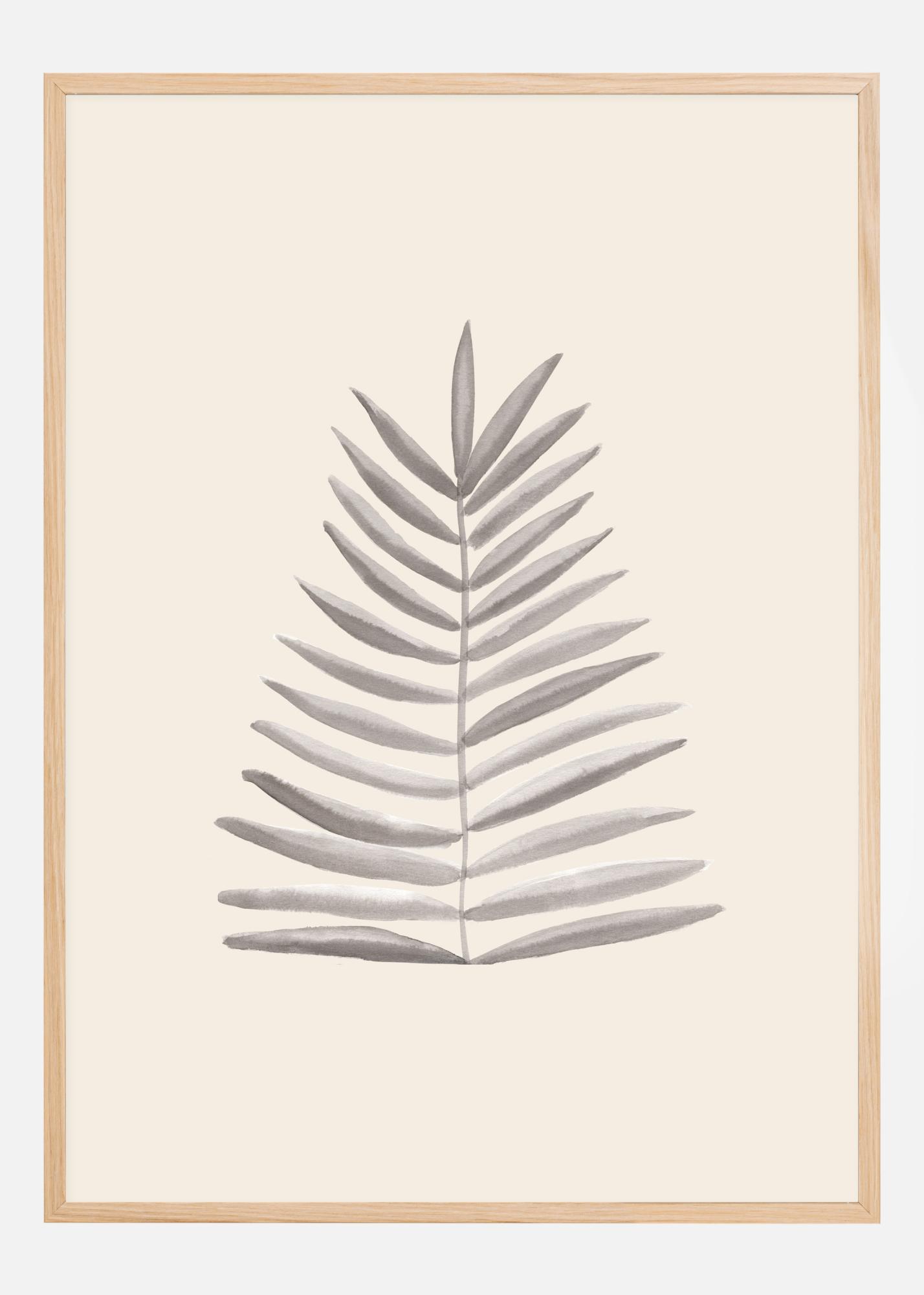A simple yet clear print of a palm leaf. Drawn on a creamy coloured surface, the leaf stands upright on its midrib. The cream coloured base enhances the small brown palm leaf. Add this touch of class to a coloured wall