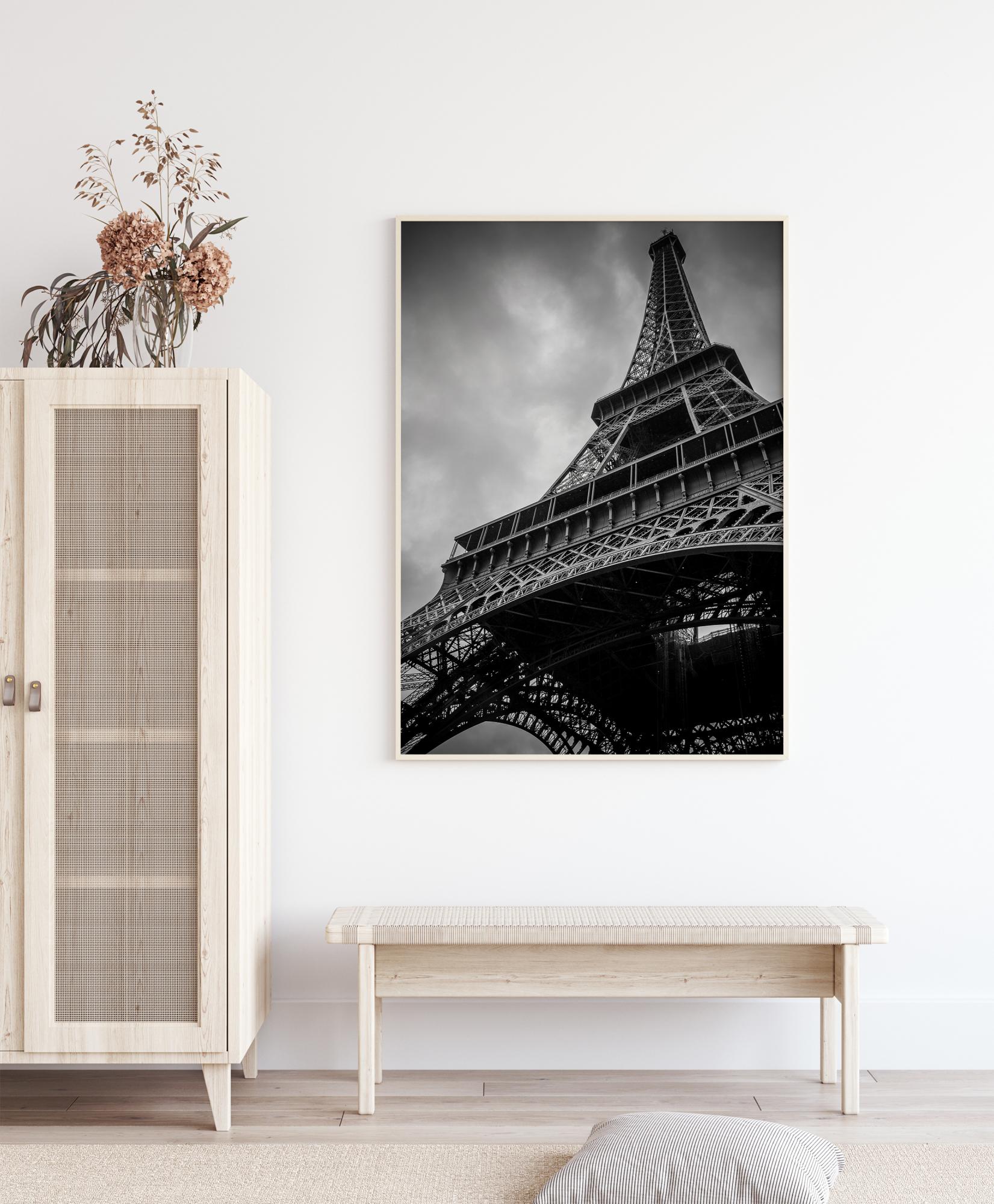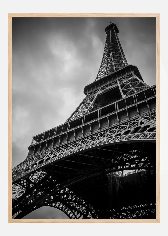 A bottom-up perspective print of the breath-taking Eiffel Tower. With the cloudy grey sky, this beautiful puddled iron structure shows off its pyramid like shape as it rises tall. For anyone who loves Paris, this is an ideal print to give as a present.