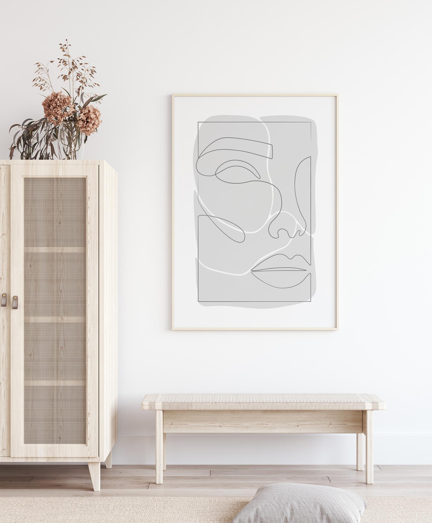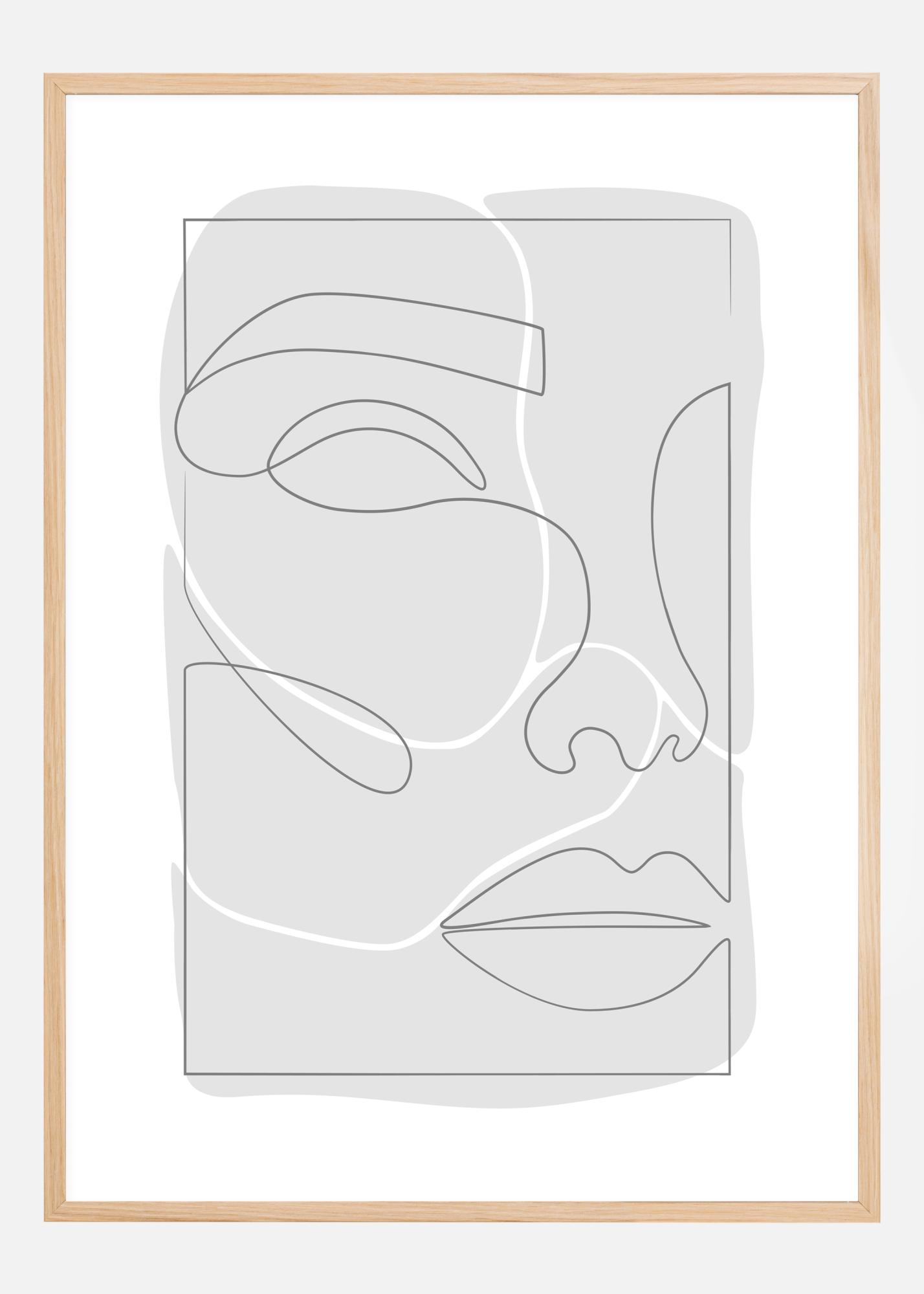 A beautiful poster of a female face. Drawn on a grey background, the single line drawing in black, outlines the woman's nose, lips, eye and eyebrows. To add a touch of white to this beautiful print, a touch of white has been added by highlighting the woman's eye and cheek. A beautiful print for any woman.
