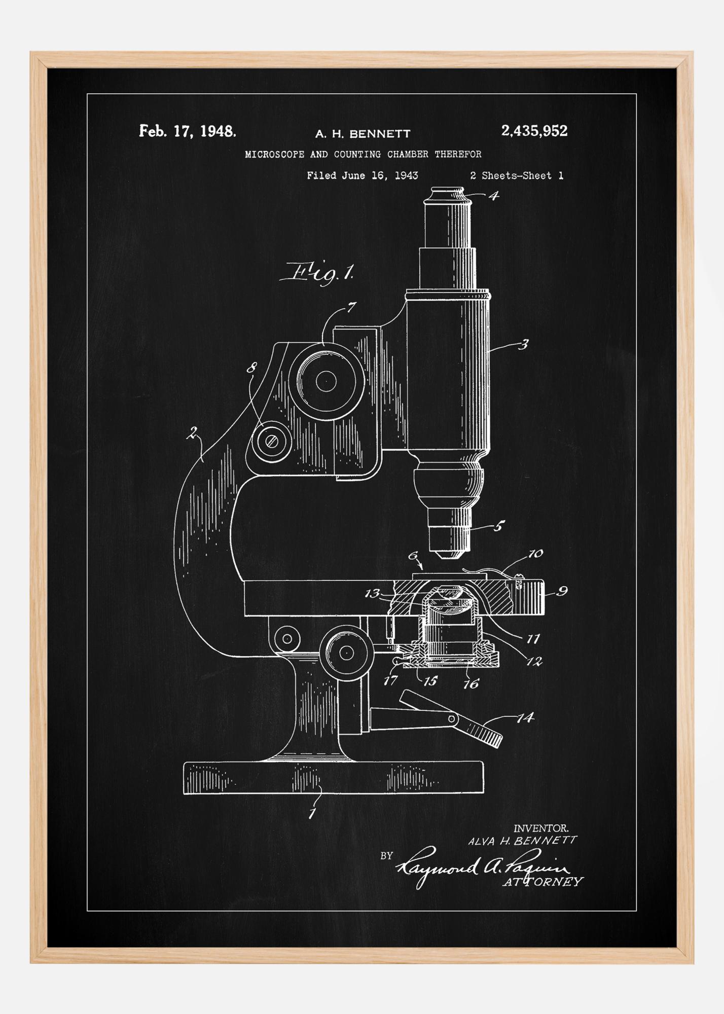 This patent poster presents a sophisticated blackboard background that elegantly highlights a classic patent drawing of a microscope from February 17, 1948. The white lines against the dark background create a dramatic effect and illustrate the microscope's construction and the innovative features of its counting chamber. This is an iconic depiction of scientific precision and beauty in functional design.