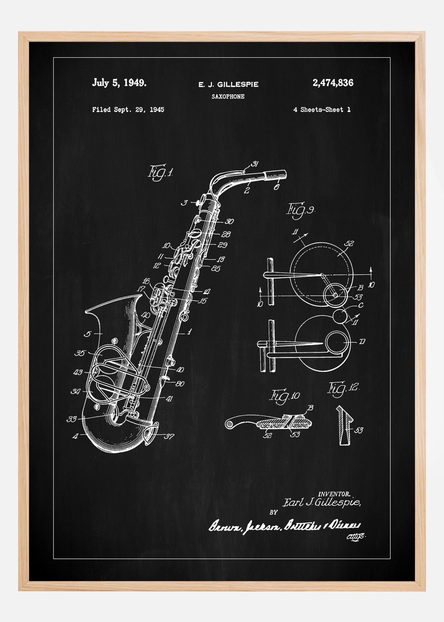 The black background provides a bold and modern contrast that highlights the white lines and creates a striking visual effect that captures the viewer's attention. For jazz enthusiasts, music historians, and design lovers, this patent drawing offers an artistic and historical perspective on one of the most iconic musical instruments of all time. A patent poster like this is more than just a decorative piece; it is a tribute to the innovation and musical expression that the saxophone represents.