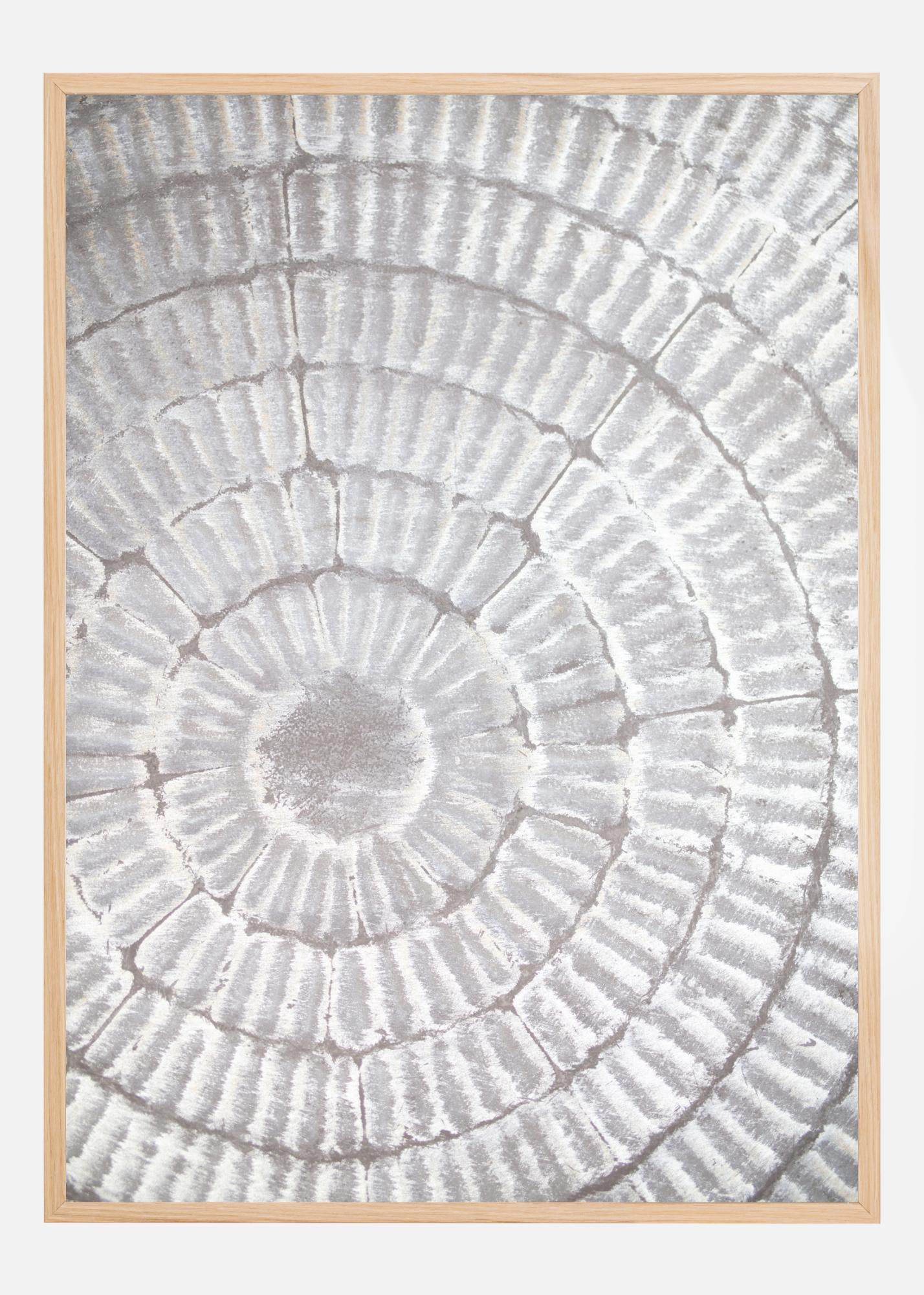 A glassy picture of a grey pattern plate. The circular beige and white rings create a ribbed look to the plate forming a perfect smooth circle in the middle. With its soft soothing colours, this delightful print creates mysterious yet peaceful. Ideal for a colourful wall.