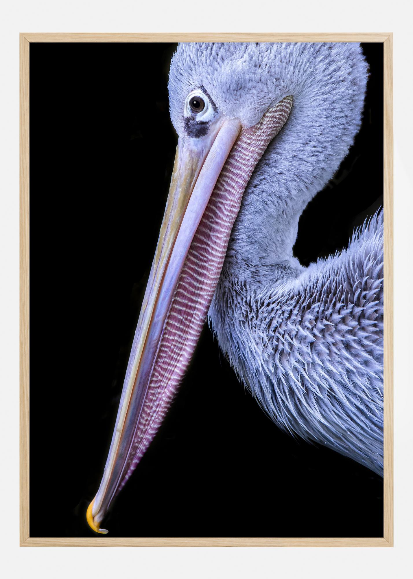 This striking poster highlights the beauty and detail of a pelican, with its unique beak and plumage captured against a deep black background. The impressive bird's beak, in soft shades of pink and yellow, provides a powerful contrast that gives the motif a vibrant and almost three-dimensional depth. A perfect print for all nature lovers and bird watchers who want a piece of the wild in their home.