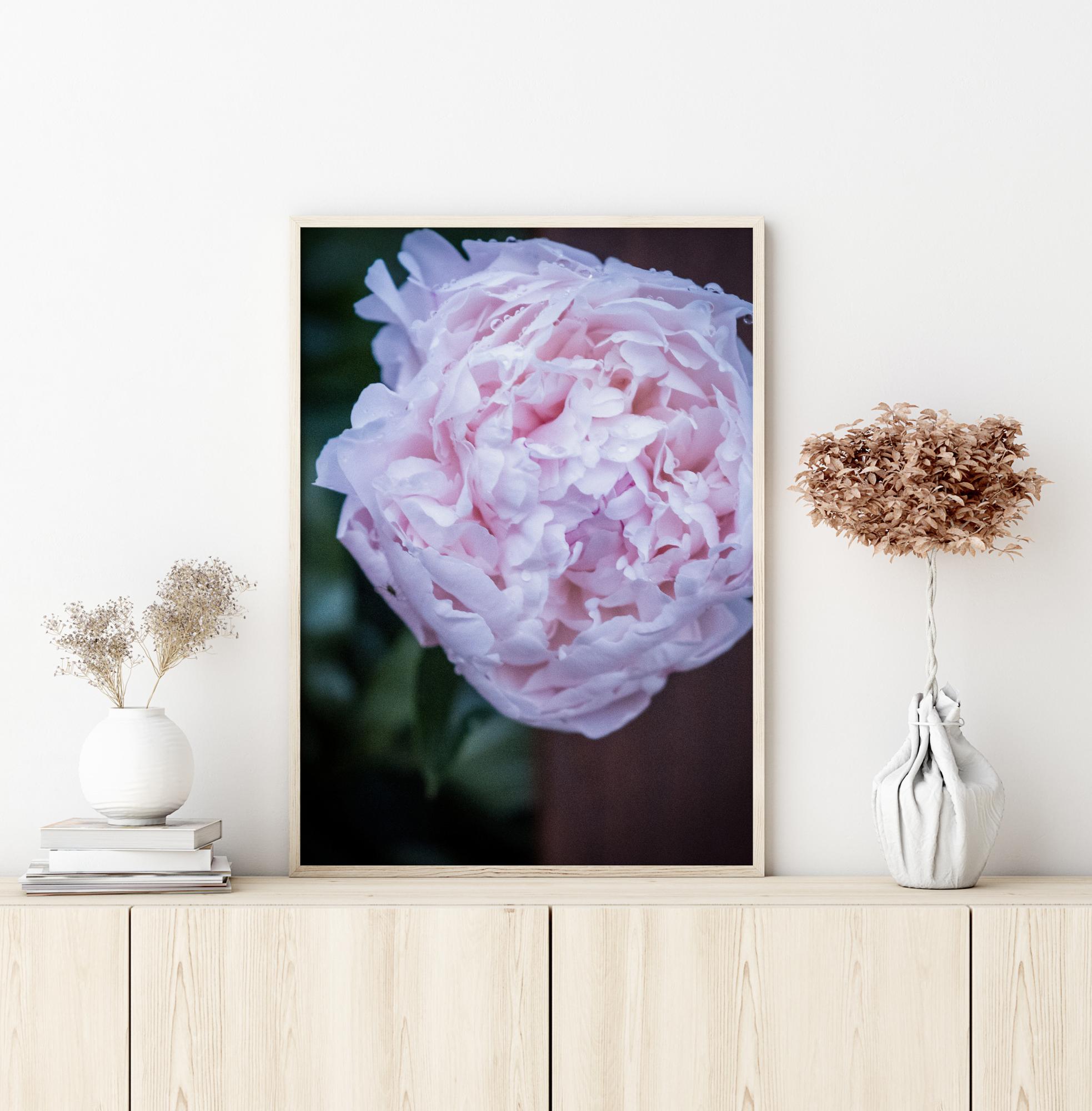 A beautiful close-up poster of a pink peony with clustered petals. Each petal creates a delicate soft look. The blurred green background adds that extra touch of colour to this delightful print. Hang this print in any room of the house to brighten up your day.