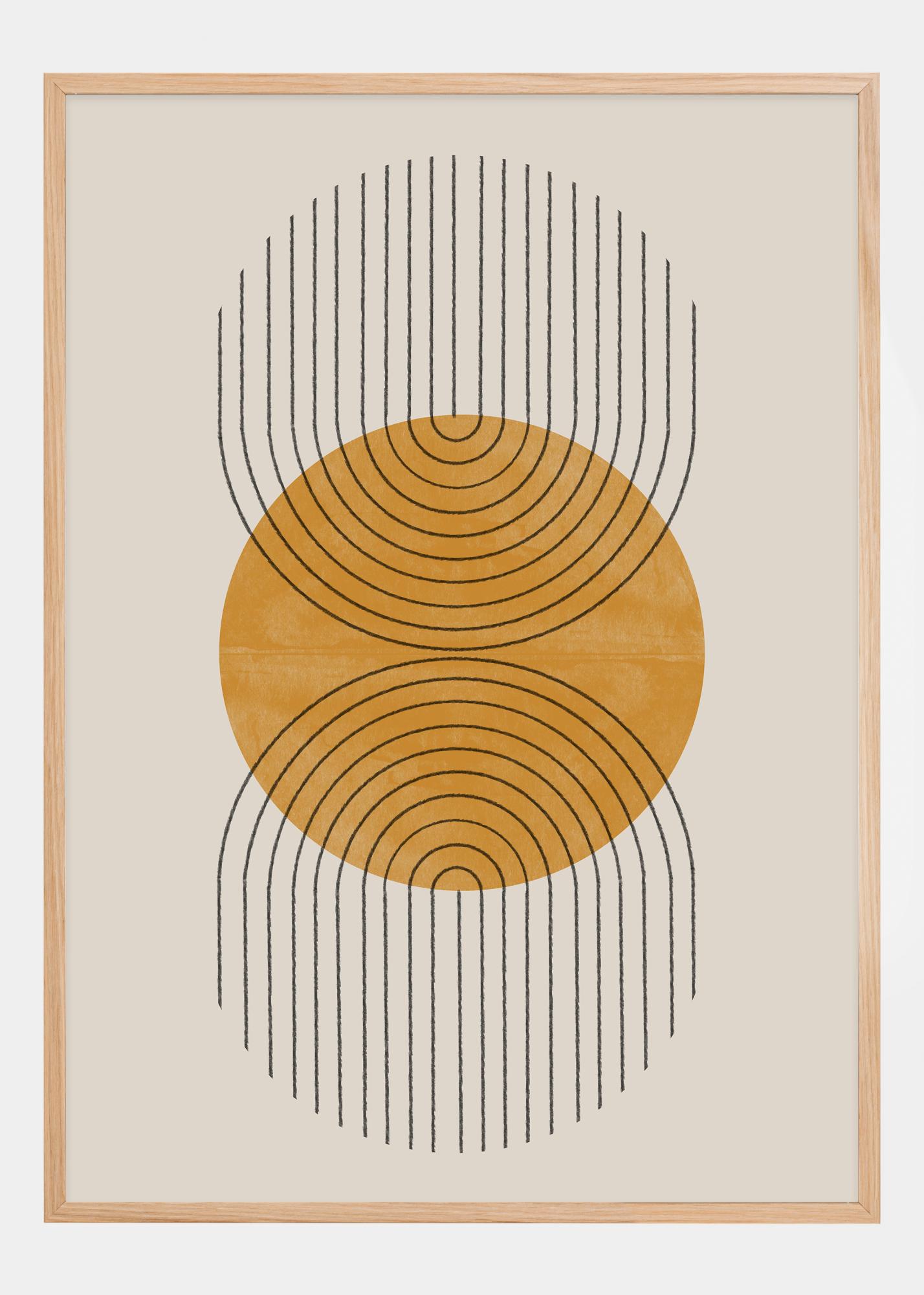 This artful poster presents a strong visual composition by placing a saturated, golden yellow circular form in the center surrounded by vertical black lines creating an optical illusion of expansion and contraction. The concentric circles within the yellow shape add a sense of depth and provide an organic quality to the otherwise strictly geometric pattern.