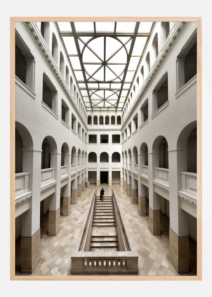A magnificent picture of Peter Behrens building. The beige and white interior design captures a figure walking up the stairs. The transparent roofing illuminates the architecture's work with circular and square shaped windows allowing the light to shine through. Create a classy atmosphere with this stunning print.