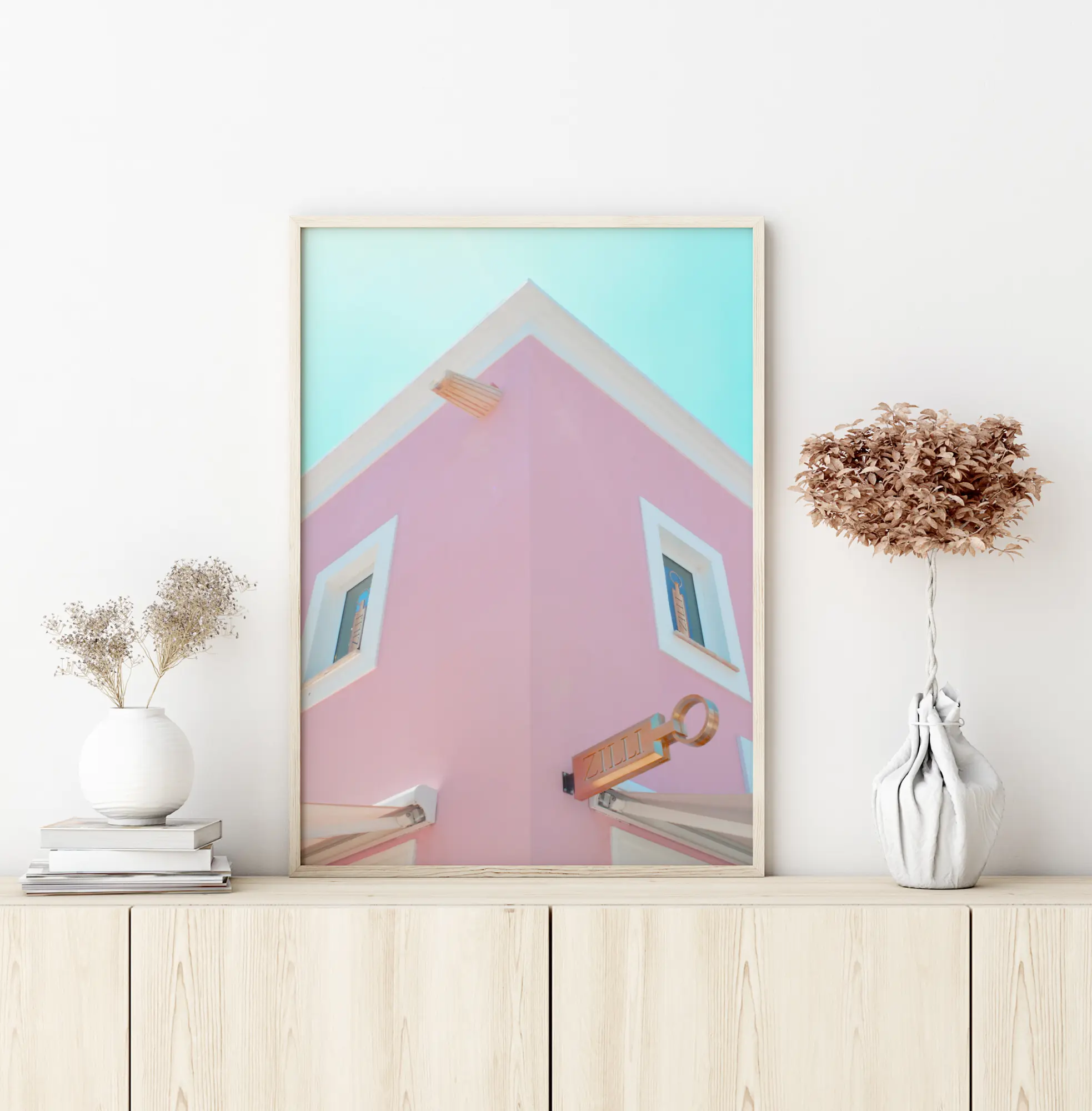 A super trendy building lined with white window trims. The light-blue sky beautifully enhances the bright pink shop. A golden shop sign with the name Zilli is hung on the corner of the building, while two shop canopies are open to provide shade. Add this print to a white wall and liven up the scene.