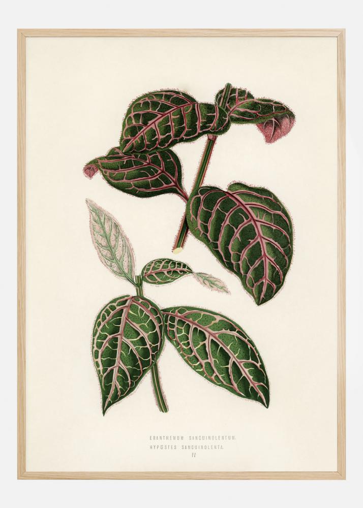 A delightful botanical print of two leafy stems. Set on a beige coloured background, each stem has four green and red leaves with white veins. The outline of the stem is highlighted with a delicate red lining which creates a warm atmosphere. An ideal print to hang in a botanical environment.