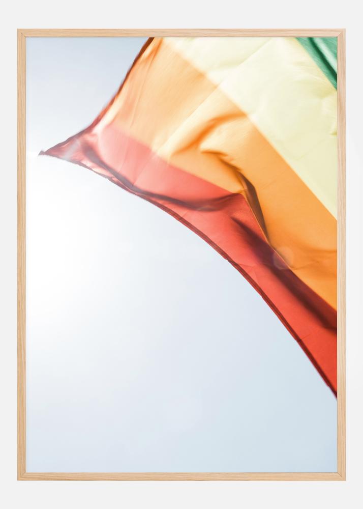 A symbolic print of a flag on a grey background. Positioned in the top half of the print, the flag is gently blowing in the wind. The red, orange, yellow and green stripes are arranged horizontally on the flag. A colourful print to brighten up any bare wall.