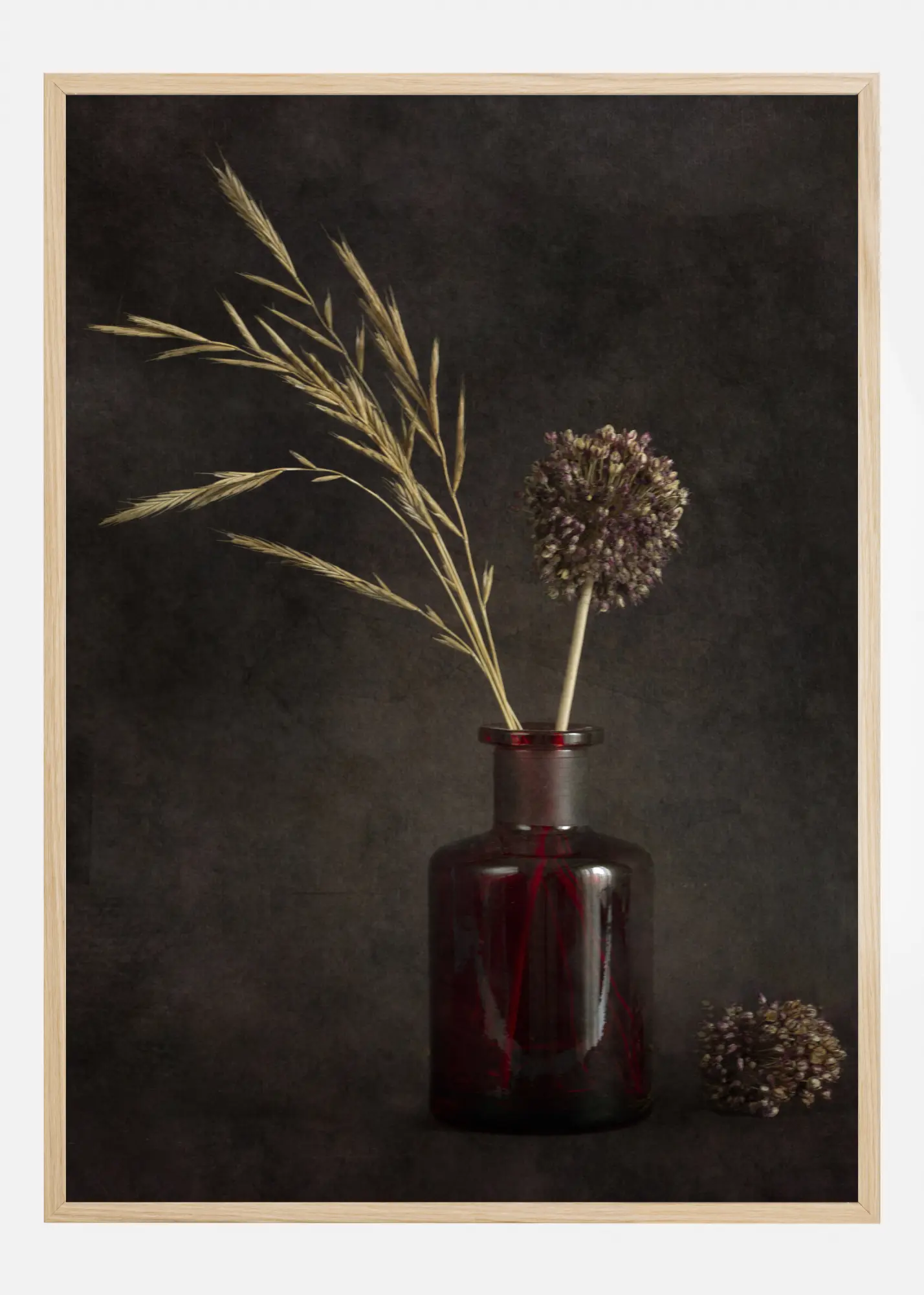 A beautiful yet simple print of two dried grasses in a glass jar. Set on a dark brown background, the yellow coloured grasses are positioned in a red coloured jar. To the right of the jar a dried grass lies beside the jar. A beautiful print to add some colour to a white wall.