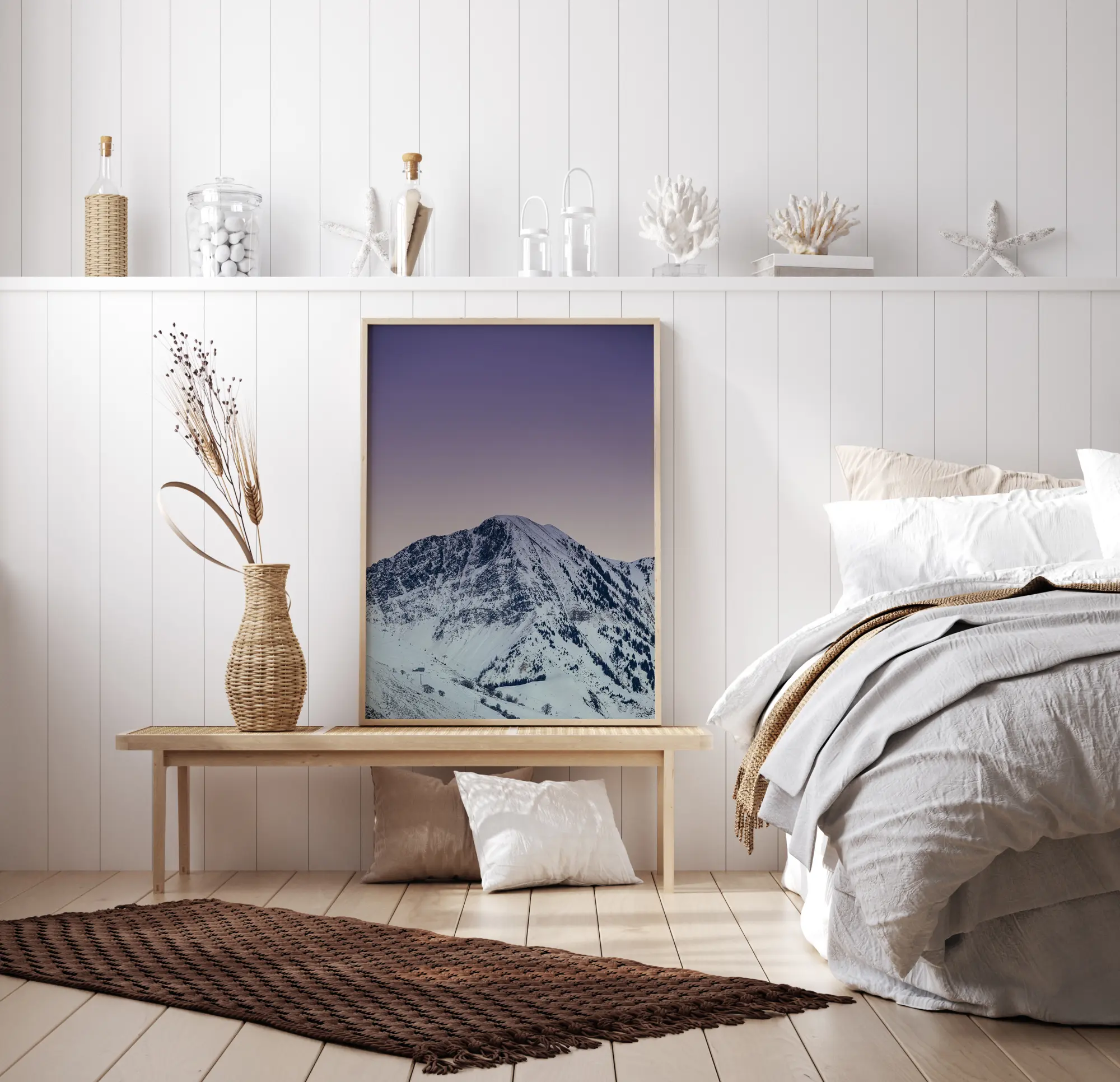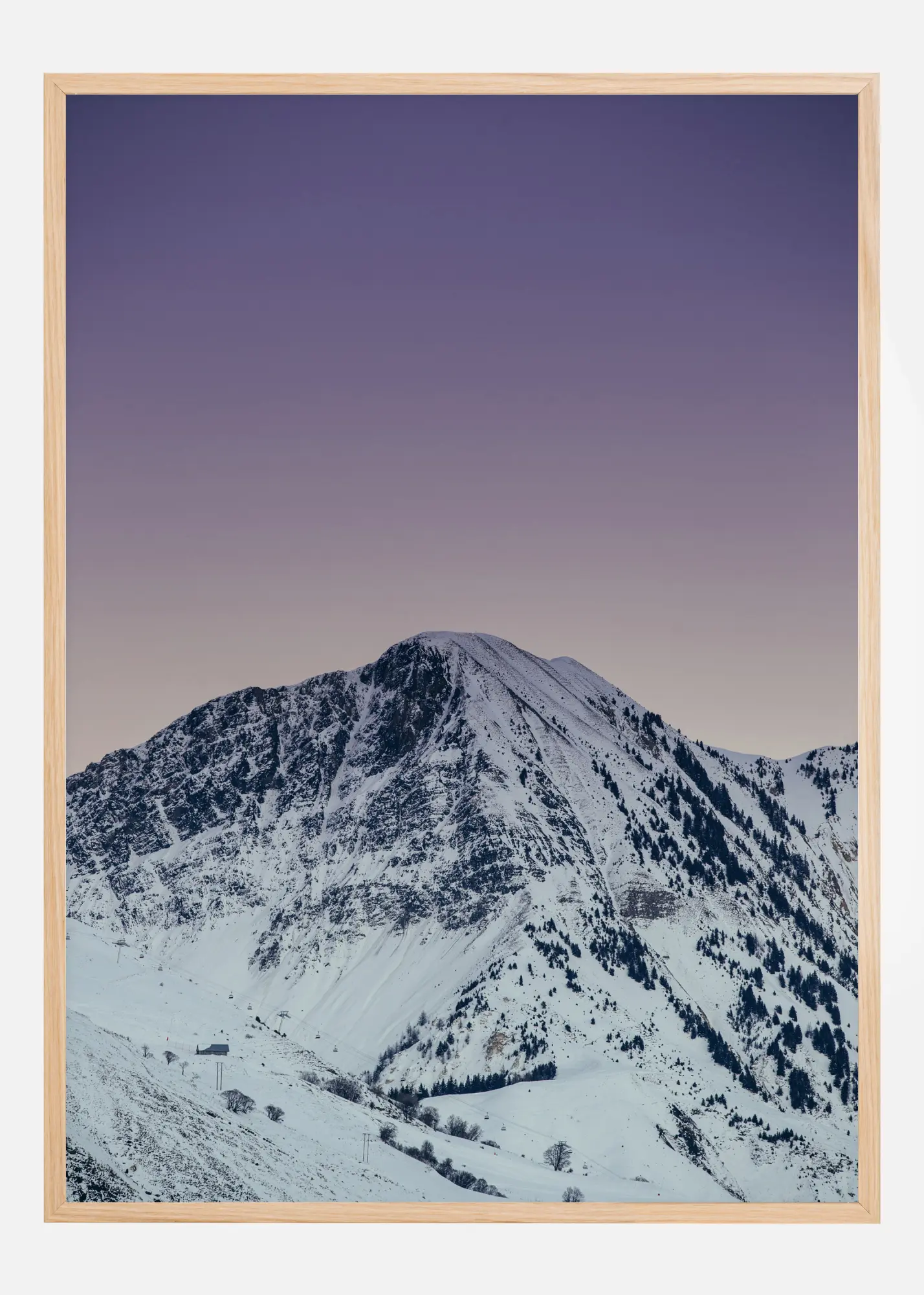 A starry night poster of a massive white mountain. This impressive snow-covered mountain sits under a stunning purple sky. The mauve sky reflects on the mountain tops creating a warm feeling to the print. A beautiful print to hang in a cold environment.
