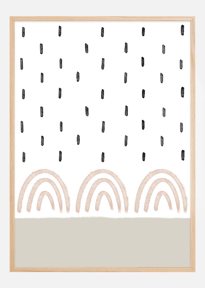 This artistic poster, "Rain on Rainbows", combines playfulness and minimalism in a unique way. The motif presents a background with watercolor rainbows in soft shades of terracotta against a clean white base. Over these soft arches is a collection of abstract brushstrokes resembling rain, floating in a disordered symmetry. The colors in the rainbows contrast beautifully against the ink-black "raindrops", creating a dynamic yet harmonious image.