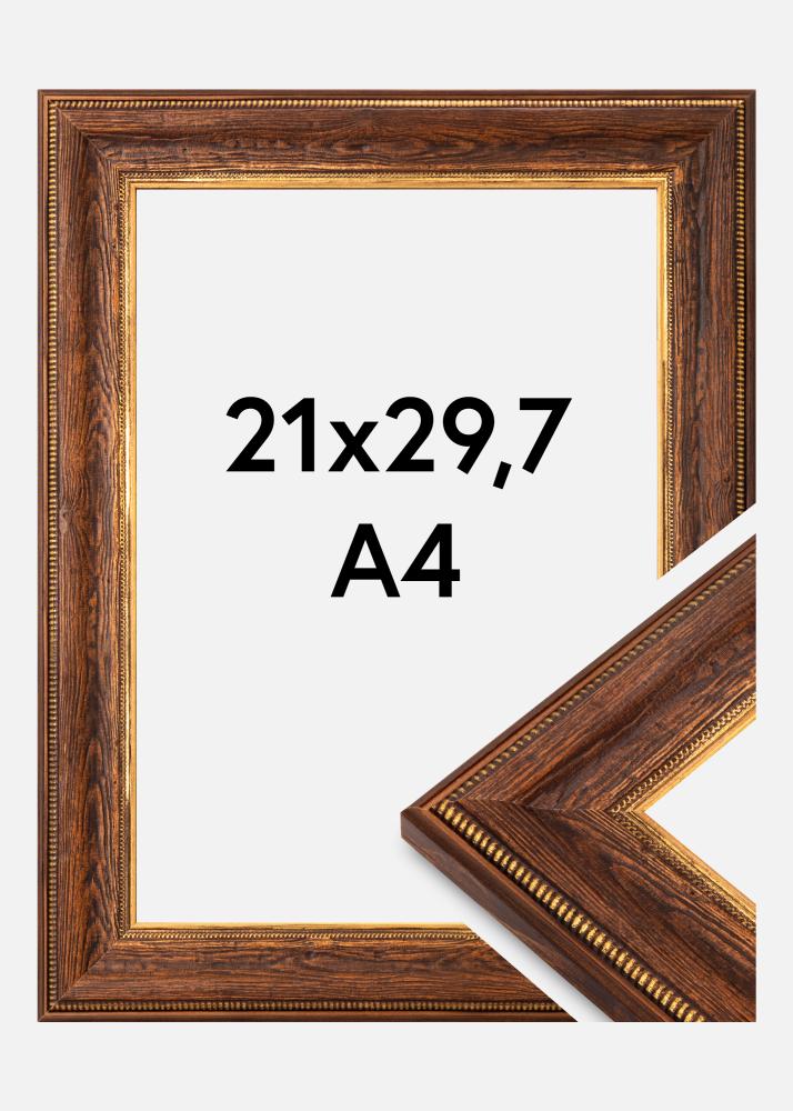 This elegant photo frame in the size 21x29.7 cm is a perfect combination of rustic charm and classic elegance. Made of high-quality wood, the frame features a deep brown color with decorative gold details along the inner edge. The wood texture is clearly visible and gives a warm and natural feel, while the gold-colored accents add a sophisticated touch that fits excellently in traditional and vintage-inspired interiors.