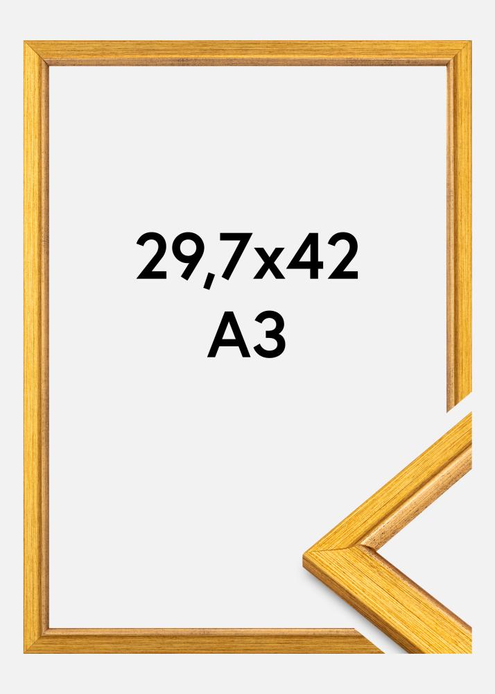 This gold-colored photo frame fits perfectly for subjects in the size 29.7 x 42 cm and is an excellent choice for those wanting to give their pictures an elegant framing. Whether you want to display artworks, photographs, or posters, this frame will highlight your subjects in a stylish way.