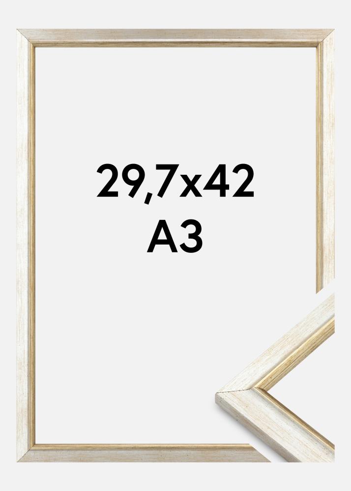 This elegant silver photo frame is a perfect combination of modern design and classic charm. With its subtle brushed finish, it adds a sophisticated touch to your photos and artworks. The frame is made of wood and features a frame profile that is 19 mm wide and 15 mm deep, providing a stable and robust feel. This photo frame is ideal for images sized 29.7x42 cm (A3), making it perfect for displaying your favorite photos or artworks.
