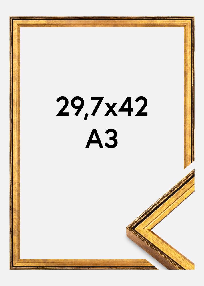 Are you looking for a photo frame that combines classic elegance with modern functionality? This gold-colored photo frame is just what you need. With a size of 29.7x42 cm (A3), it is perfect for highlighting your favorite subjects. The frame is made of high-quality wood and has an 18 mm wide frame strip that provides a robust and stylish framing.