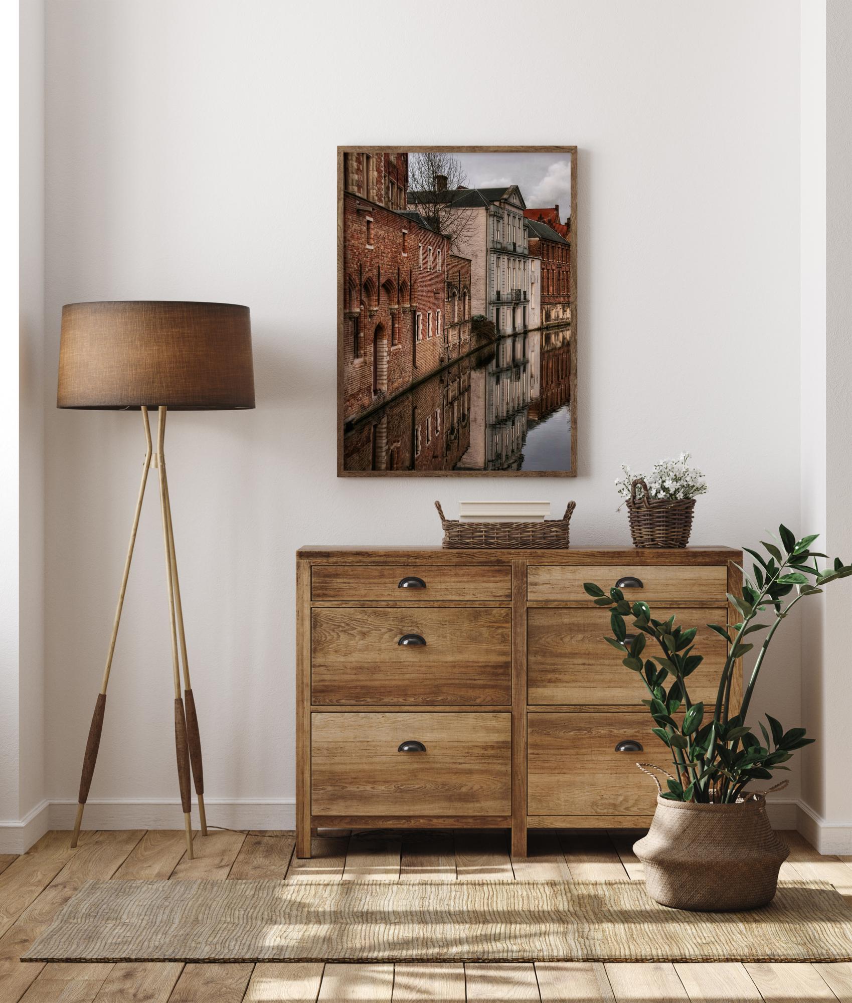 A nostalgic poster of lines of old houses along the side of a river. The simple rustic red brick houses and their architectural details are reflected in the still waters below. Imagine floating alongside these buildings as you reflect on the past.
