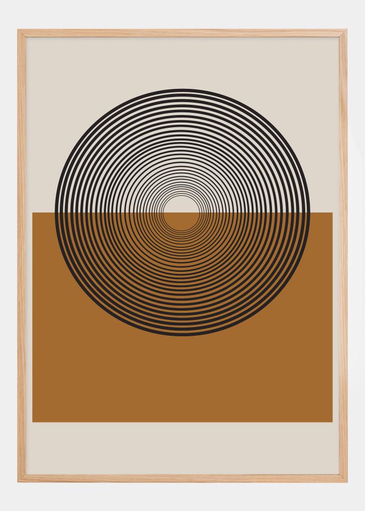 This stylish poster captures the eye with its hypnotic pattern of black lines forming an exquisite optical illusion, set against a rich ochre background representing a landscape horizon. The top half of the circular shape gives a sense of a sunset or moonrise, while the sweeping lines create a sense of movement and depth, giving this artwork a retro feel with a modern twist.
