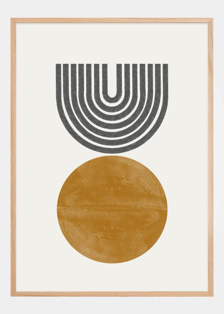 This retro-inspired poster combines geometric precision with organic curves, creating a sense of movement and retro charm. The large ochre-colored circular object at the bottom provides a strong foundation, while the black and white arches above resemble sound waves or an abstract landscape, offering an interesting contrast and depth.