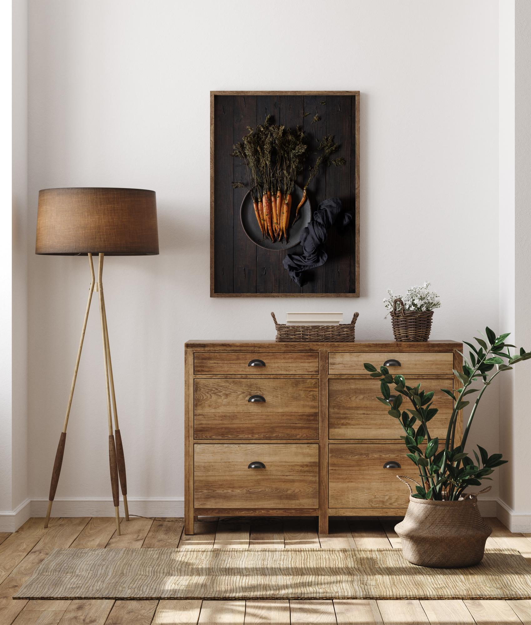 A culinary poster of a bunch of freshly pulled carrots lying on a dark blue plate. The orange carrots fairly glow as they sit on the navy plate with the dark wood behind. The wilting leaves indicate these carrots are ready to be eaten. Add this to your kitchen for a fun foodie vibe.