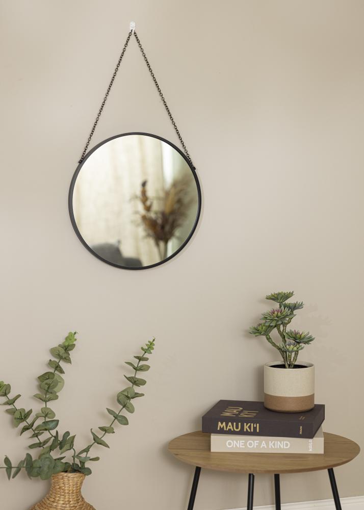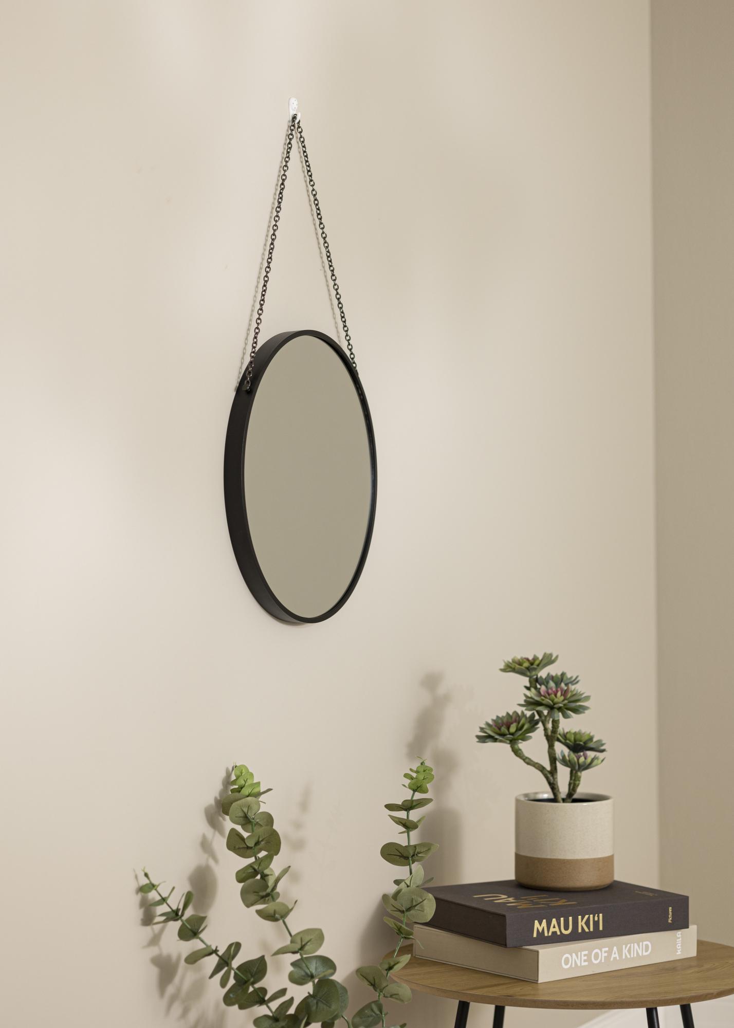 Round mirrors are a tried and tested classic for a reason! The gentle curves create a harmony in your home by softening the hard lines of your furniture and decor. This model has a deep 28 mm frame in stylish black that matches easily with other decor details. The mirror frame is made from metal. The mirror is suspended by a black chain which adds exponentially to the mirrors already elegant look.
