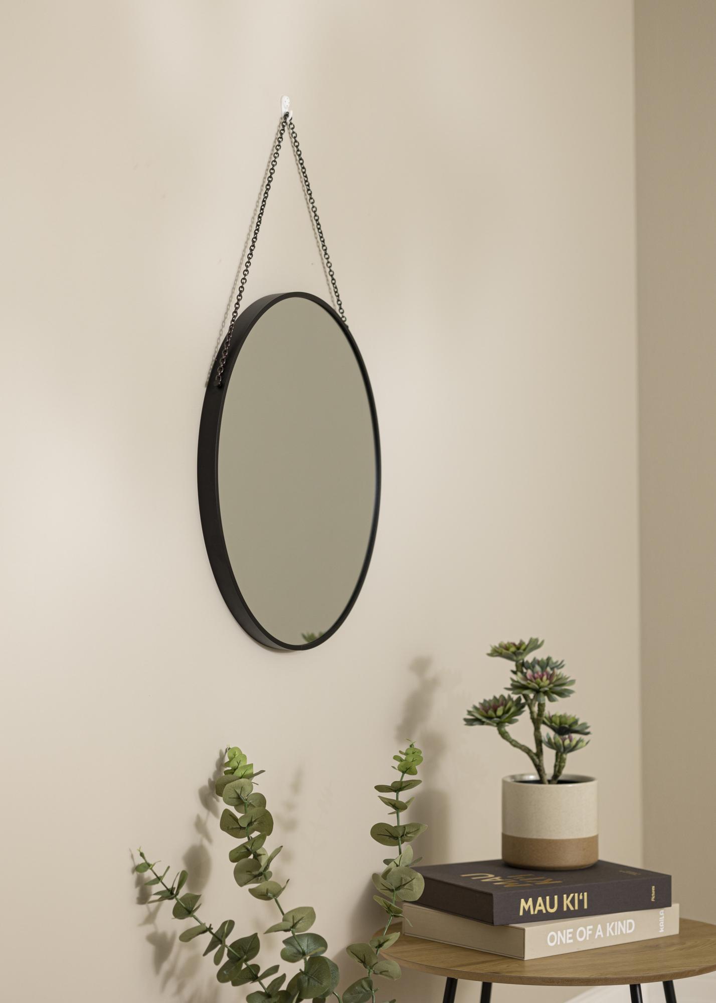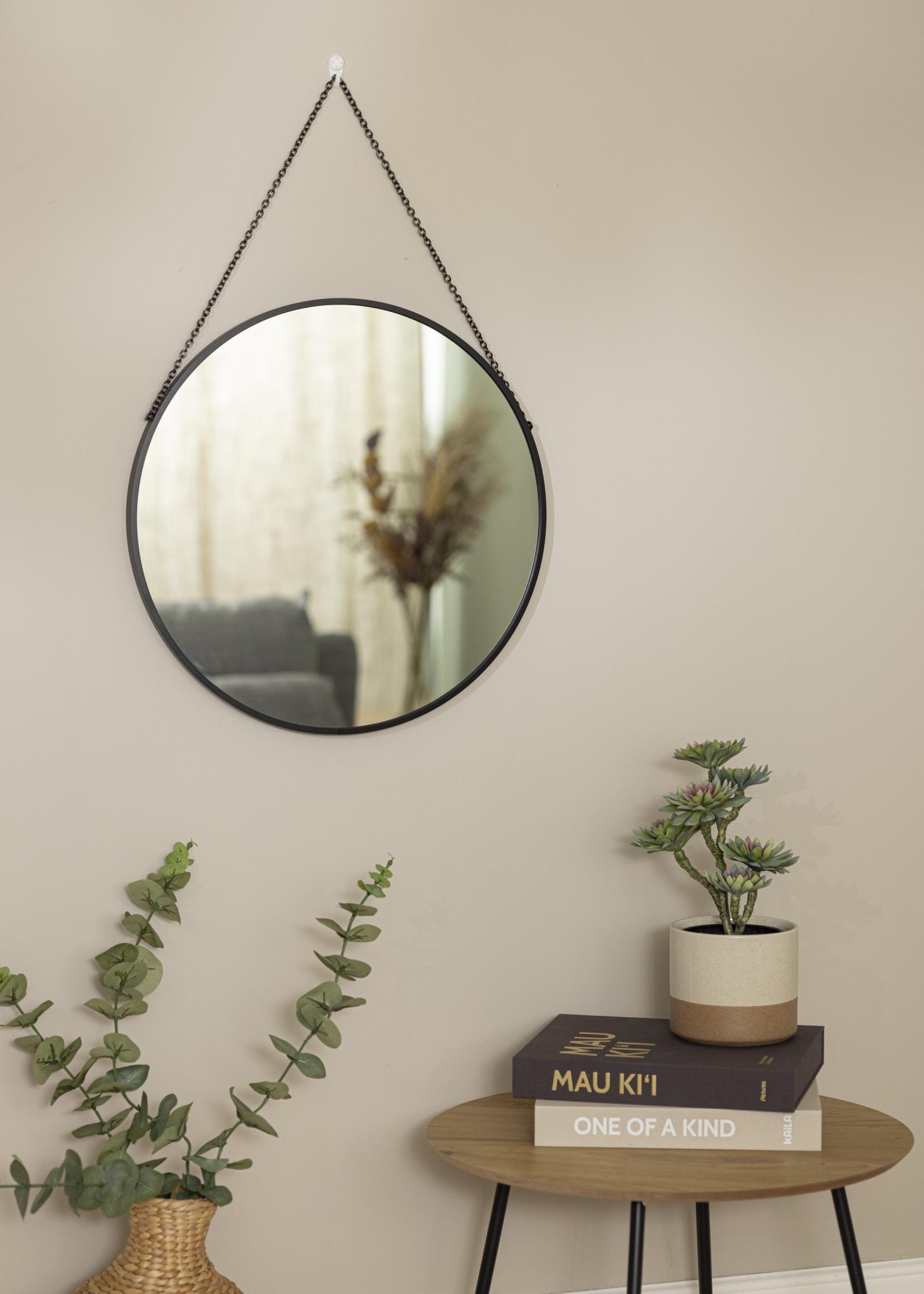 Round mirrors are a tried and tested classic for a reason! The gentle curves create a harmony in your home by softening the hard lines of your furniture and decor. This model has a deep 28 mm frame in stylish black that matches easily with other decor details. The mirror frame is made from metal. The mirror is suspended by a black chain which adds exponentially to the mirrors already elegant look.
