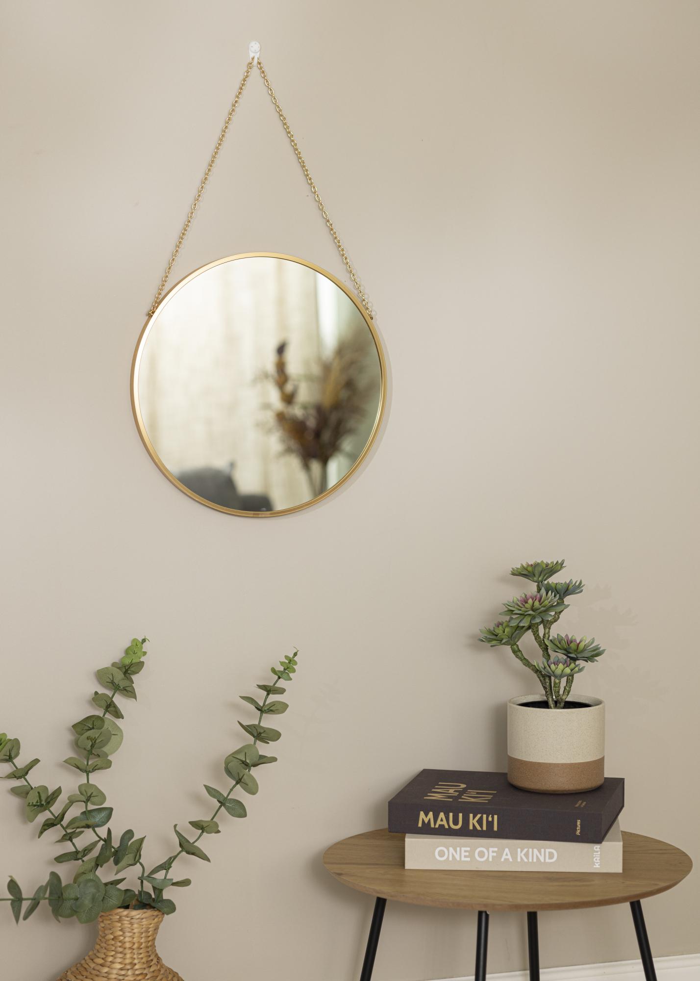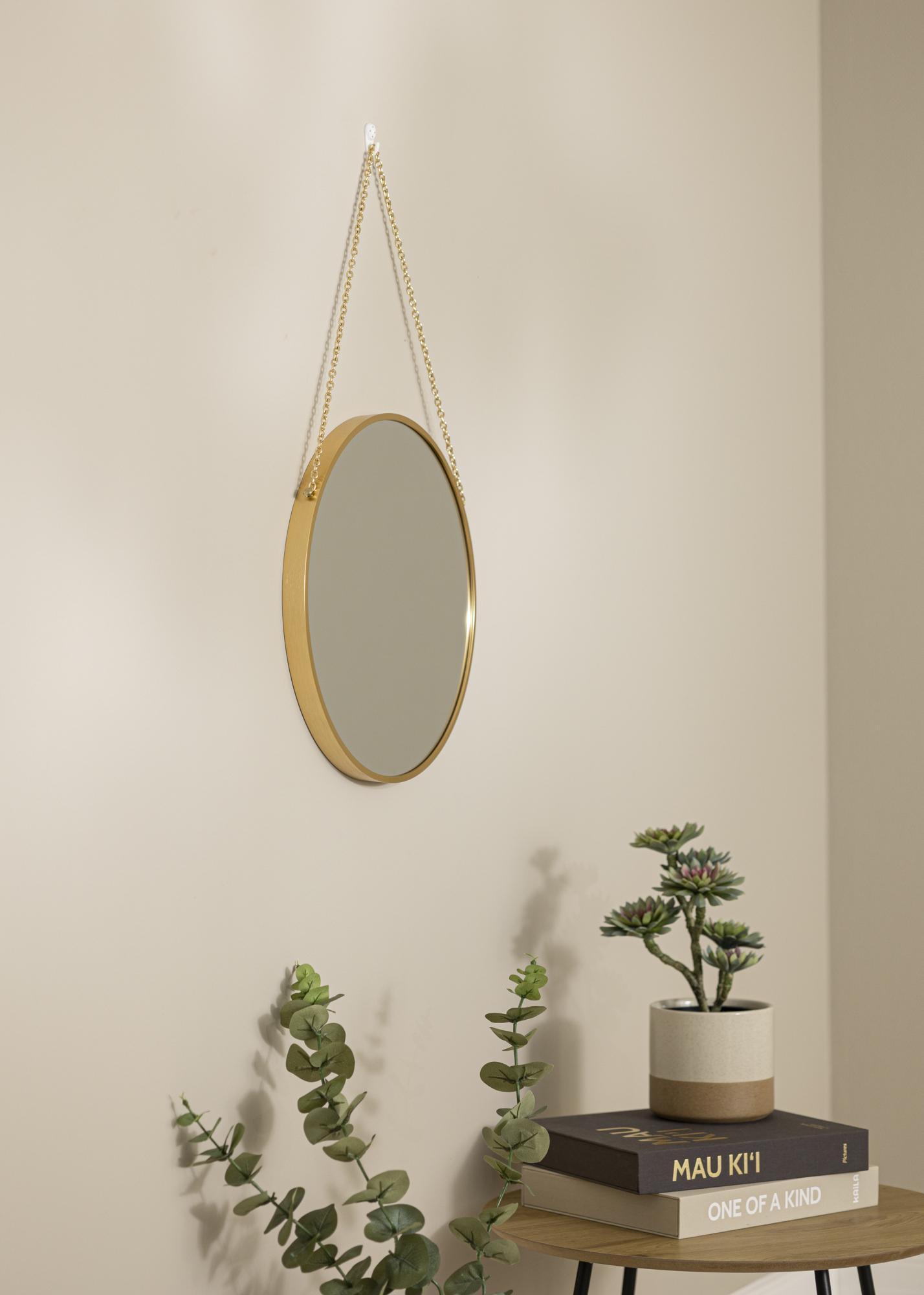 This wall mirror perfectly combines function and elegance. It has a stylish design with a soft circular shape and a 28mm deep frame in a luxurious gold colour. The elegant gold hanging chain adds a beautiful finishing touch.