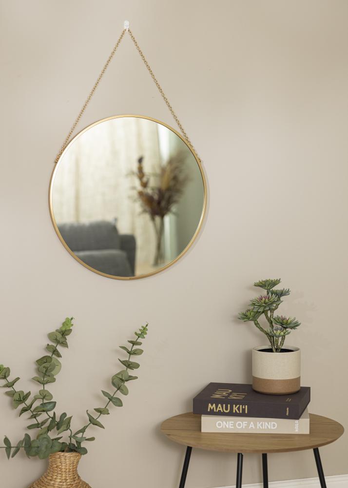 This wall mirror perfectly combines function and elegance. It has a stylish design with a soft circular shape and a 28mm deep frame in a luxurious gold colour. The elegant gold hanging chain adds a beautiful finishing touch.