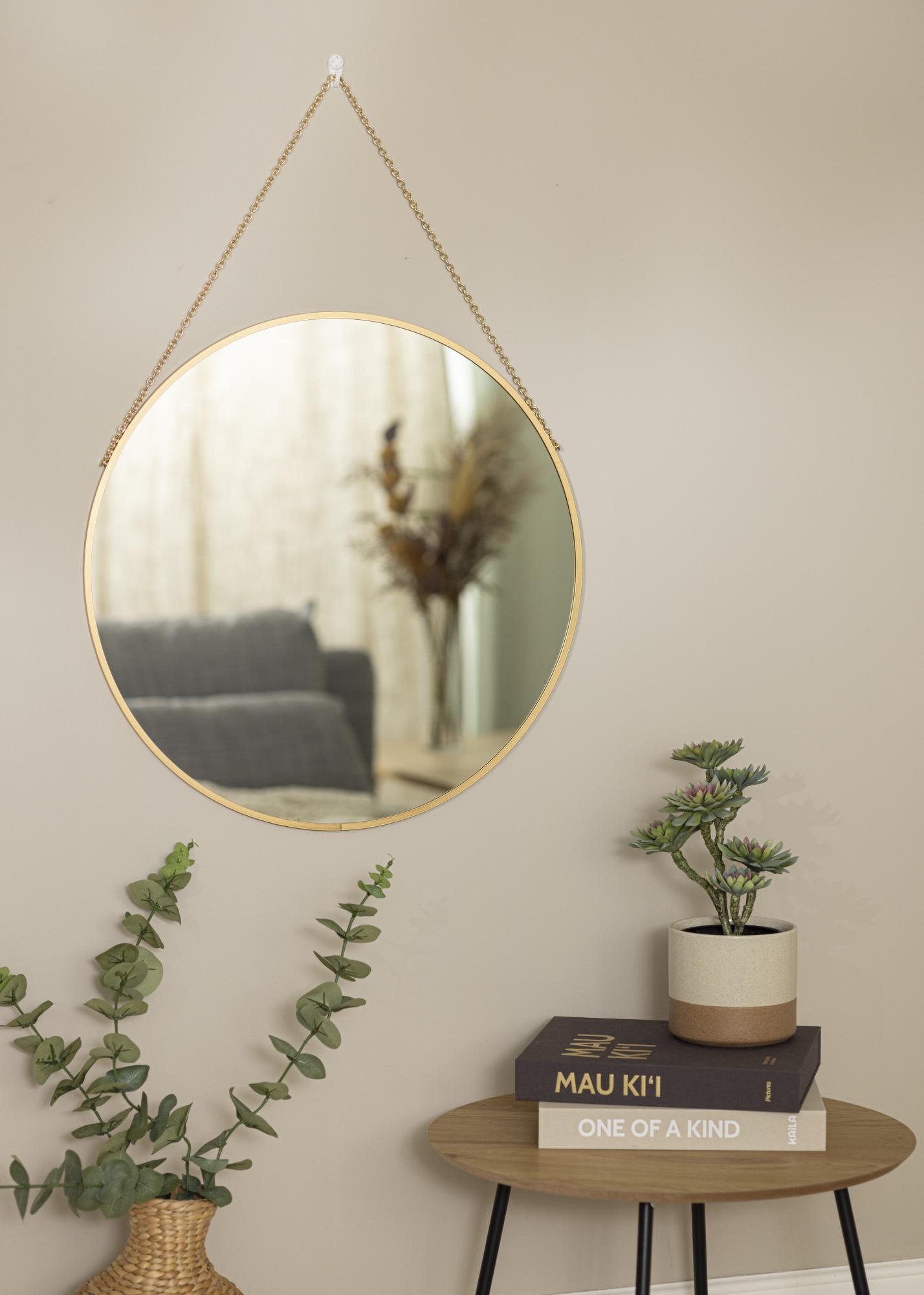 Add a touch of elegance to your home with this beautiful wall mirror! Its circular shape and depth of only 8 mm give this mirror a sophisticated appearance. The frame, which is made from metal, comes in an exclusive gold colour as does the elegant gold chain used for hanging the mirror.