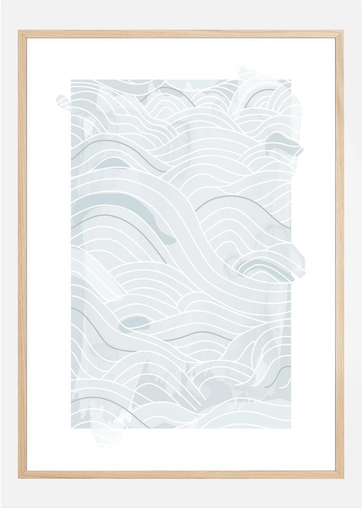 An ocean poster with soft blue abstract lines and waves on a white background. Different tones of blue and various line thicknesses combine to make these undulating waves across the page. Let your mind wander and get swept away with this soft ocean design.