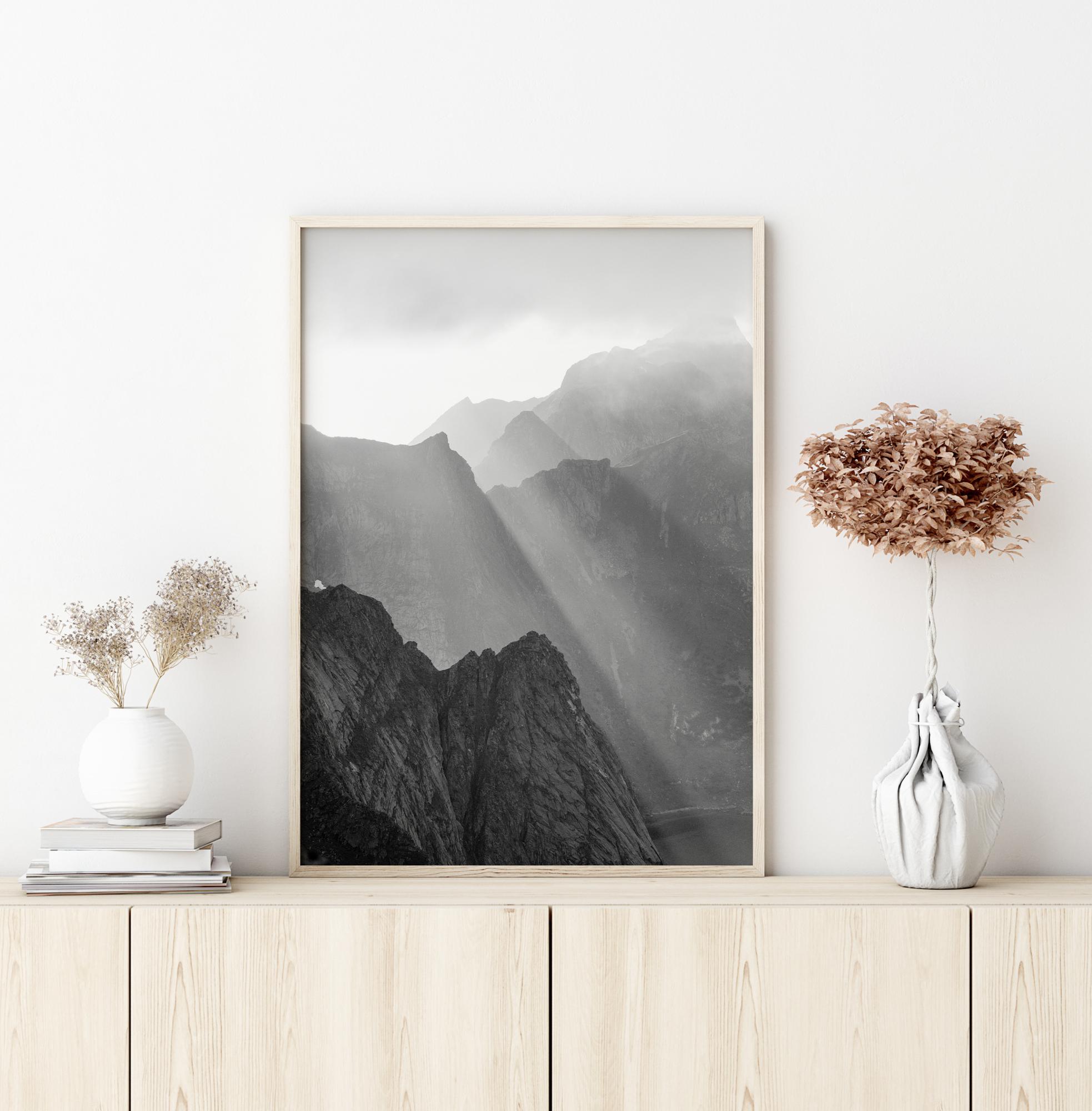 A majestic landscape poster where a beam of strong sunlight shines down through the mountains. The dark craggy forms of the mountain side rise up into the bright white of the sky where the sun shines through. Add this stunning shot to your wall for a dramatic, yet magical, scene.