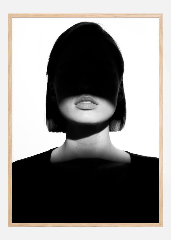 This striking poster captures a powerful image of a woman whose eyes are hidden by a dark shadow, creating a mysterious and thought-provoking effect. The sharp contrast between the white highlights and the deep black tones accentuates her defined lips and sculptural facial features. It is an image that balances on the edge between visibility and anonymity, light and darkness, and invites the viewer to search for deeper meanings.