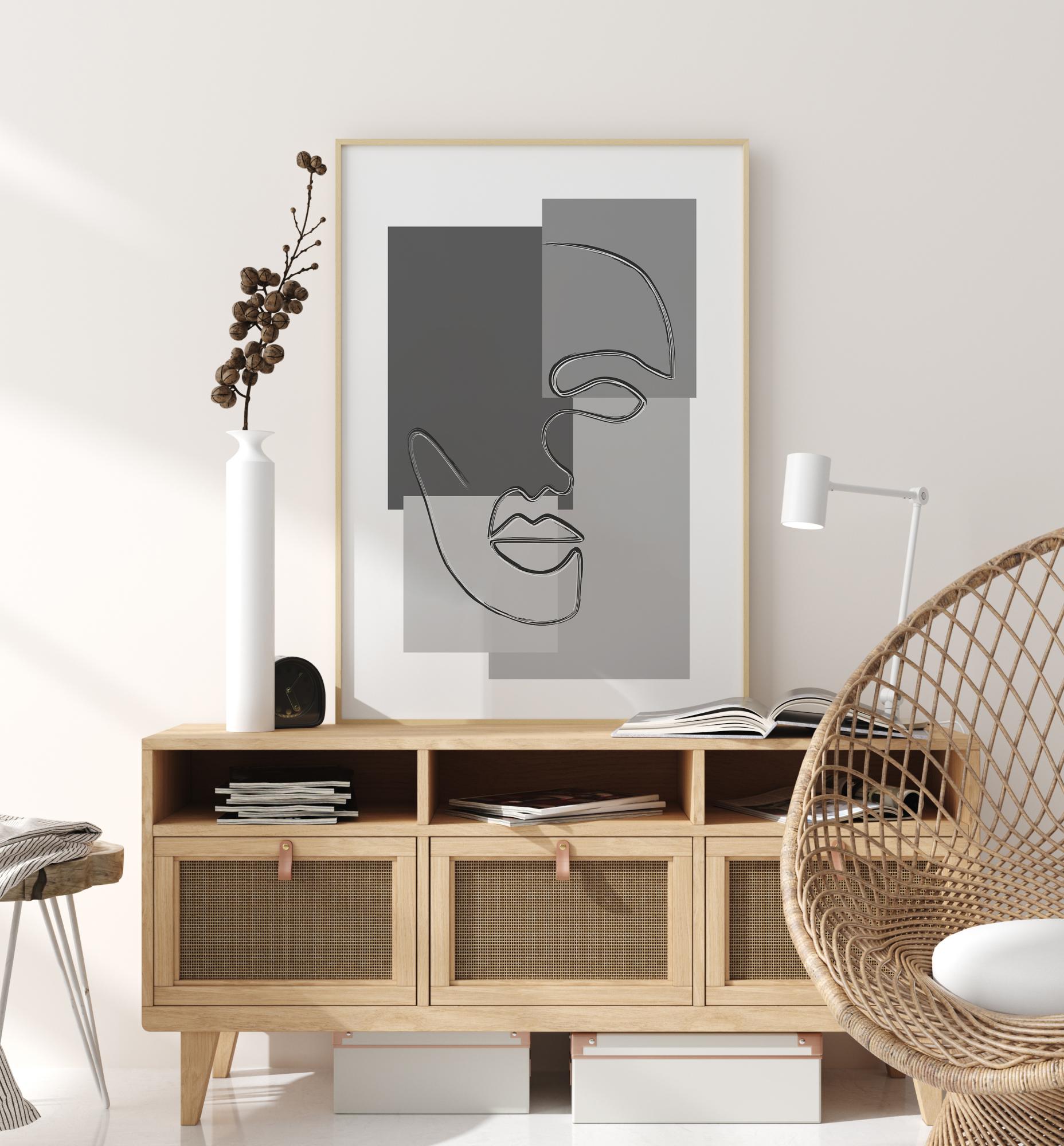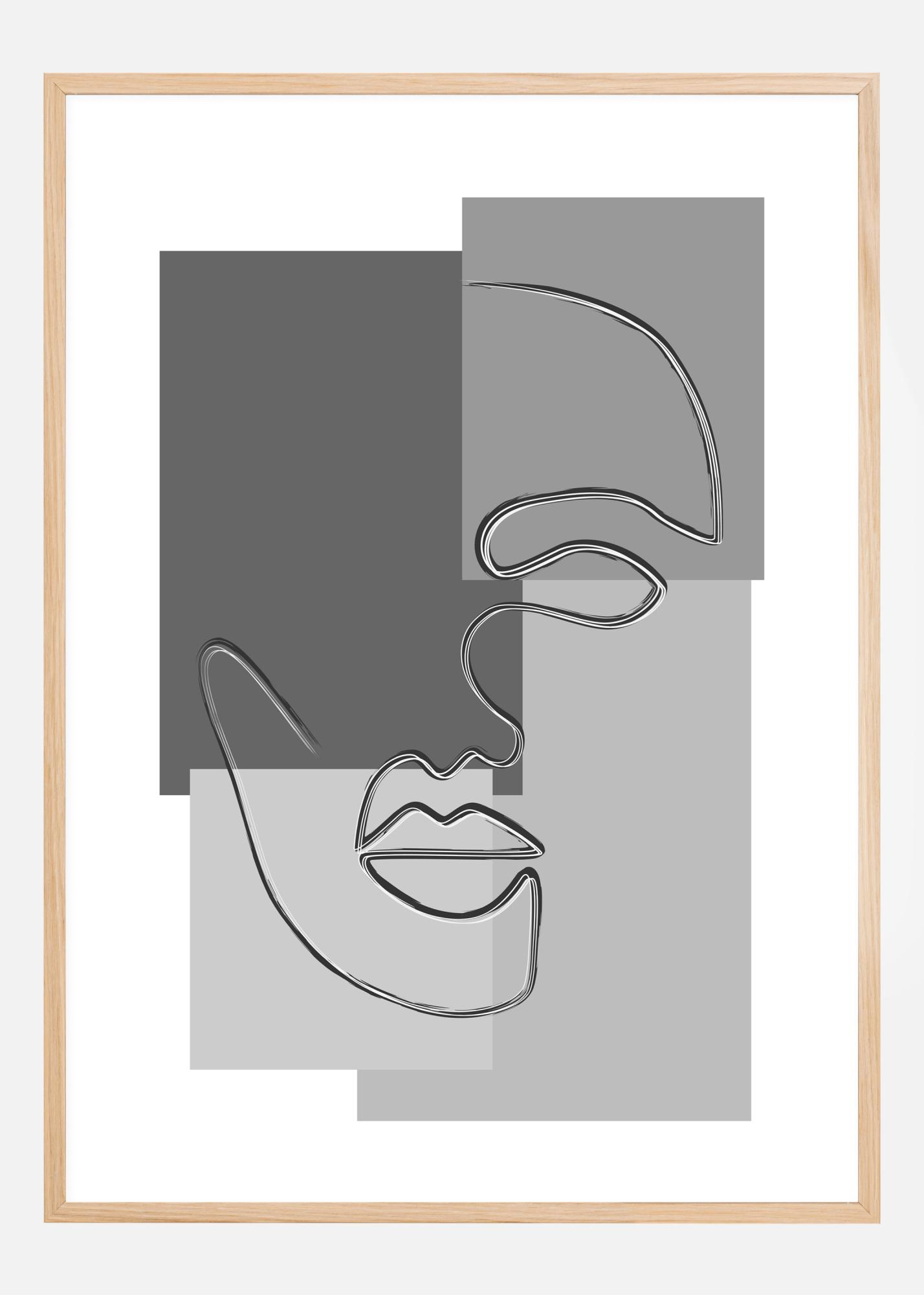 An abstract poster of a face drawn on top of three different coloured rectangles. A single fluid line draws the face from the eye to the nose to the mouth. The face sits on top of four rectangles, each a different grey tone for a more modernist look.