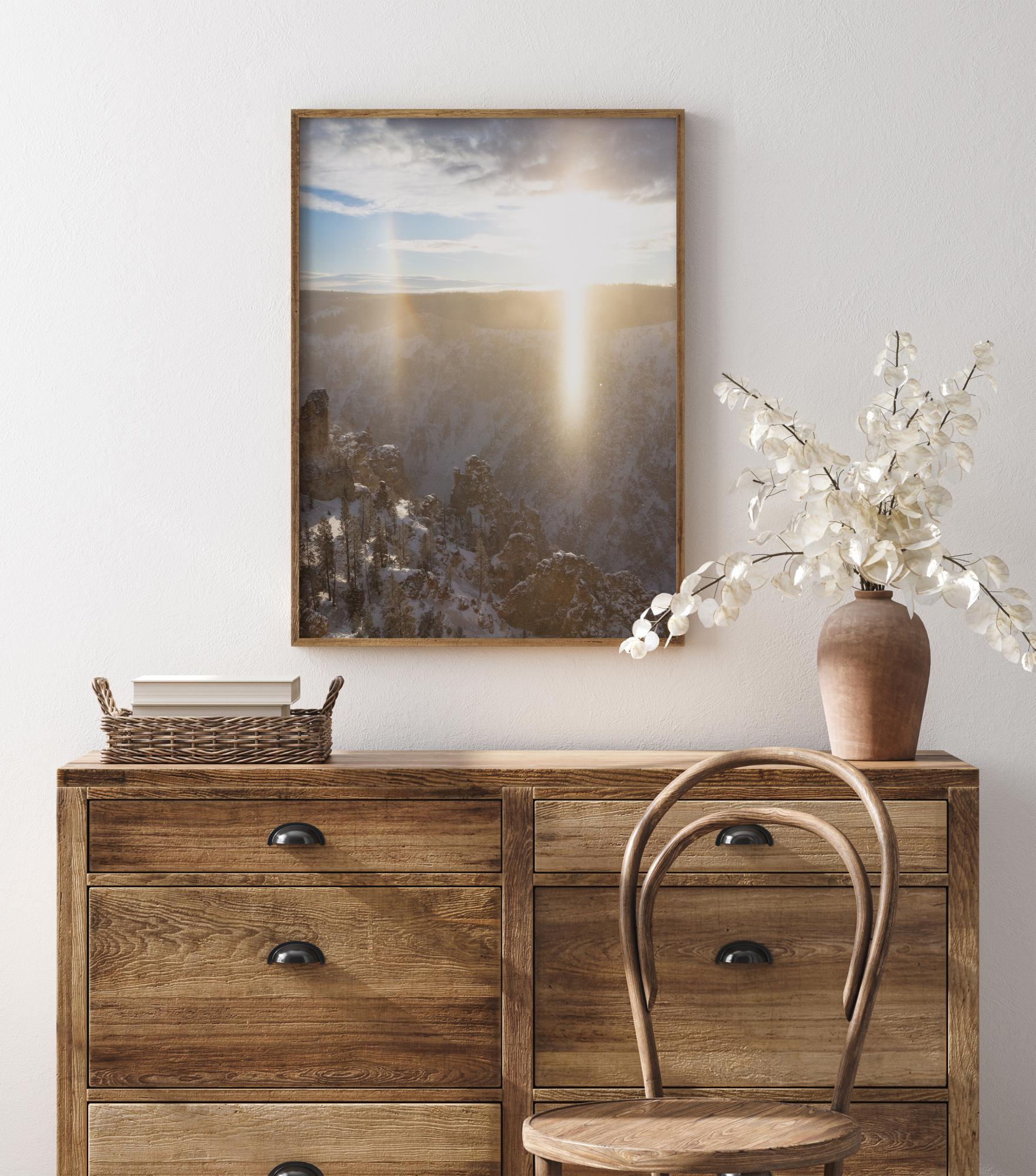 A scenic poster of the top of snowy mountains. The sun is high in the sky shining brightly across the mountains and creating a bright glow and lens flare above the rocks. Clouds roll overhead as the sun hits the snowy peaks for a dramatic, yet wintery feeling image.