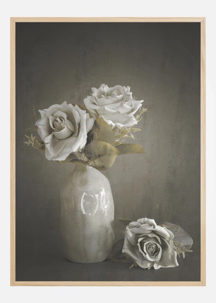 A simple poster of painted roses in a vase. Two white roses sit in a white vase, a third rose is placed on the shelf beside it. Each rose glow with unseen light against a soft, but dark grey background creating an elegant yet theatrical image.