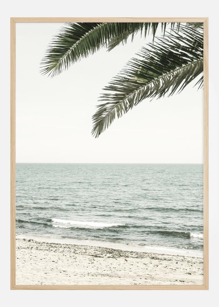 Experience the peaceful atmosphere of a tropical retreat with this poster that captures the view of swaying palm leaves against a clear blue sky and the calm sea. The soothing beach scene is framed by the vibrant green leaves, creating a natural window effect and inviting the viewer to dream away to warmer latitudes.