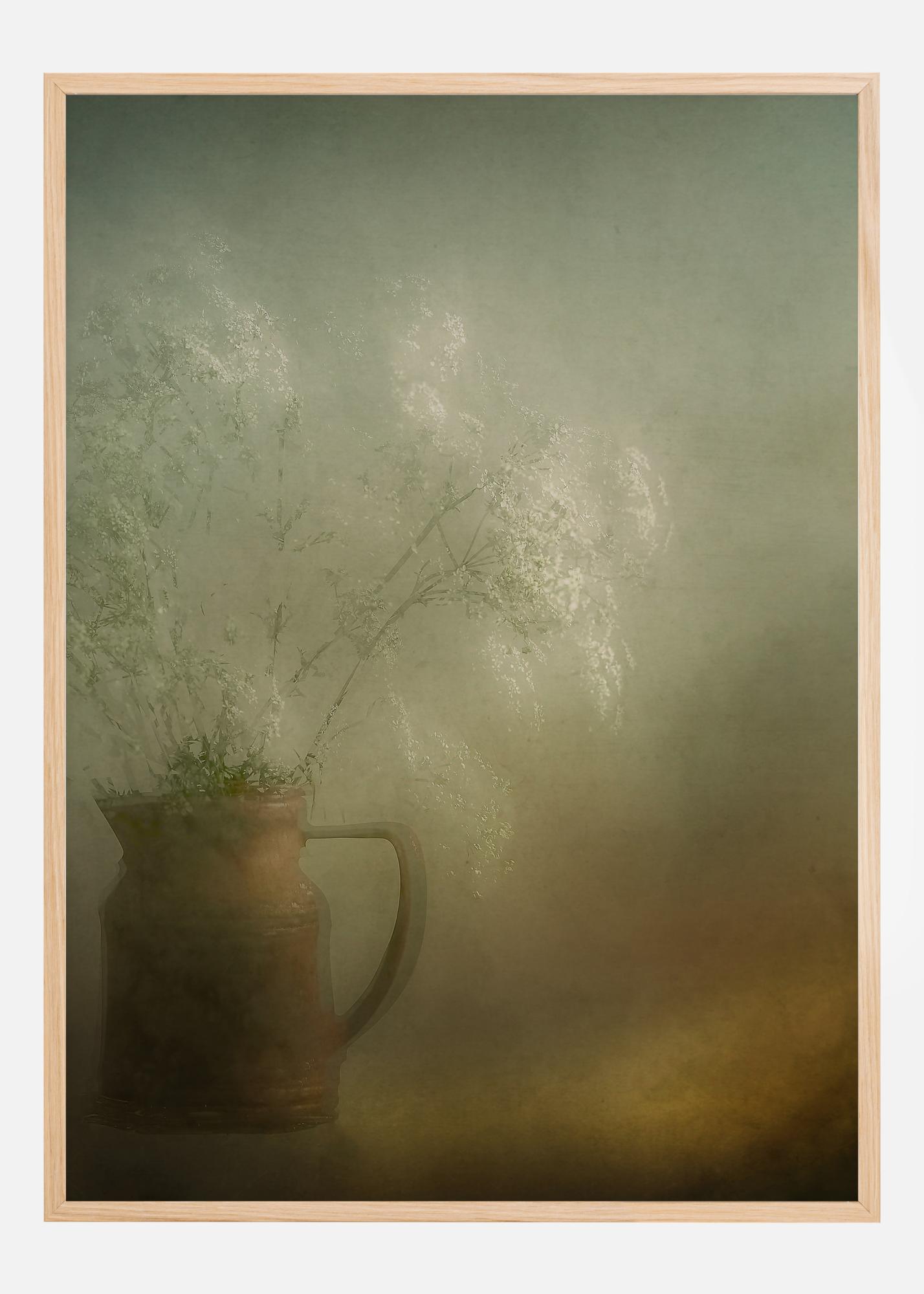 A painterly still life poster of a brown earthenware jug full of soft floating white flowers. This spring bouquet is cloud-like in nature, almost disappearing against the soft grey wall behind. An orange glow adds warmth at the base of the image where the jug sits.