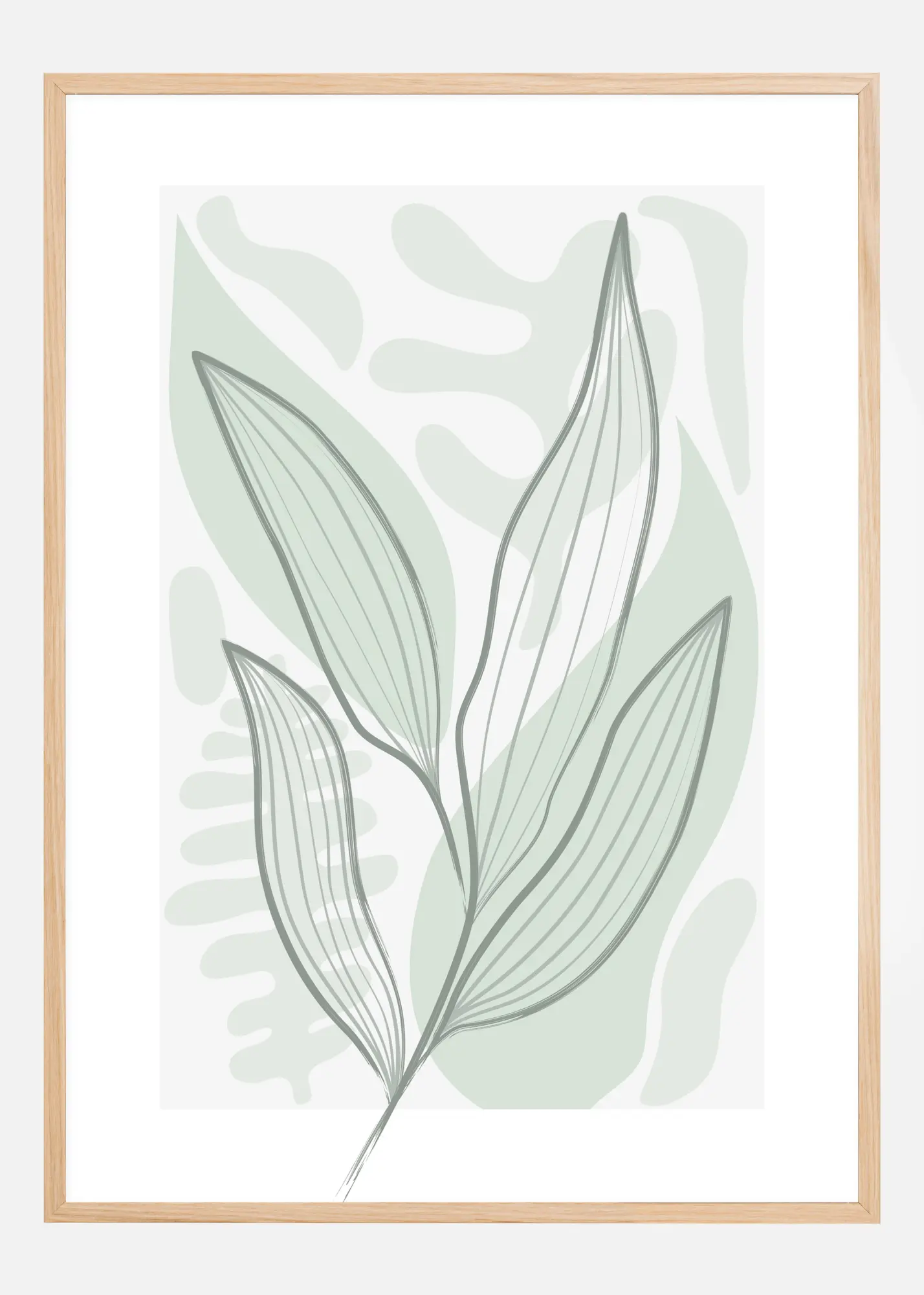 An abstract poster of leaves on a simple green background of different leafy shapes and designs. Using soft greens and greys, the simple leaf design, outlined in a strong grey line, gives off powerful spring vibes for a soft feel that can be added to any room in the house.