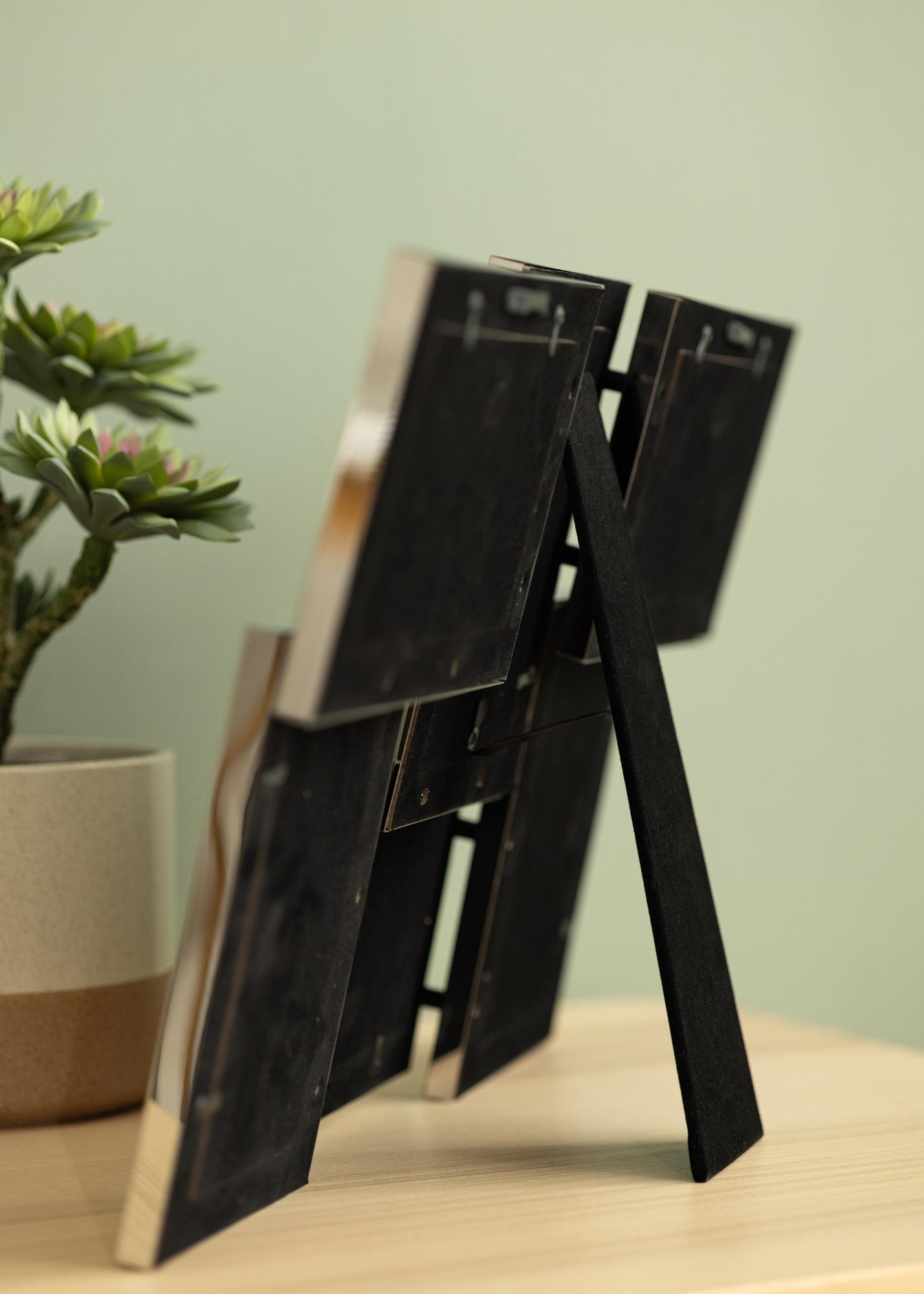 This is a collage frame for 6 photos sized 10x15 cm. The frame has a modern appearance with a robust metal construction and shiny silver finish. It’s up to you whether you want to hang your frame on the wall or stand it elegantly on a bookshelf or window ledge.