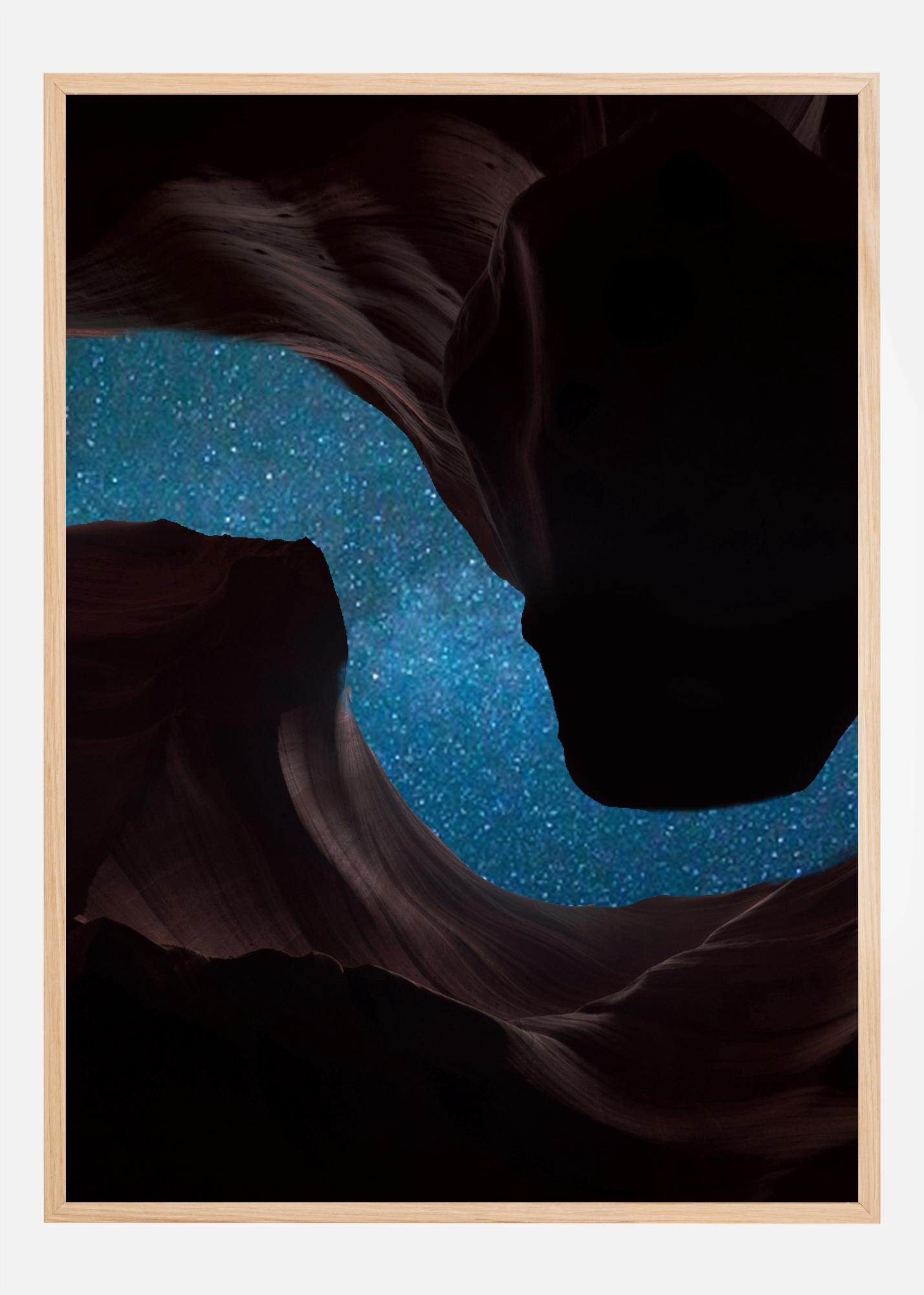 A magnificent night-time poster of the starry sky peeking out between some dramatic rock formations. The deep red rocks swirl around the top and bottom of this photo creating a starry path for the night sky to shine through in this vivid image designed to elicit awe.