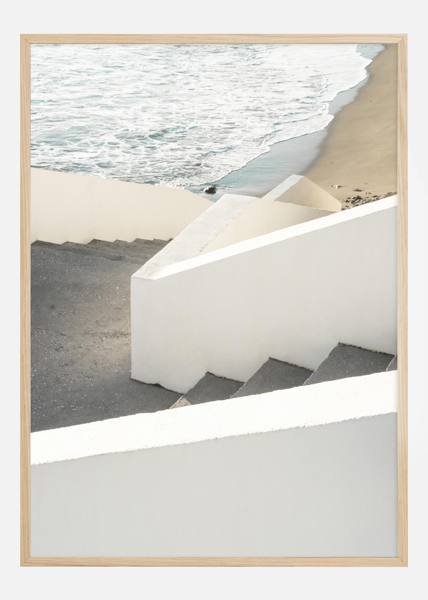 This poster conveys a sense of both architecture and nature by displaying a white-stepped structure leading down to a peaceful beach and the calm sea. The interplay between light and shadow on the steps, combined with the contrast between the strict architecture and the soft shoreline, creates an image that is both soothing and visually interesting.