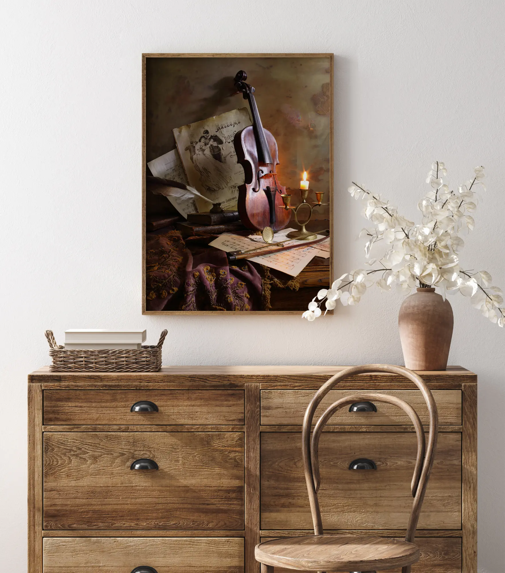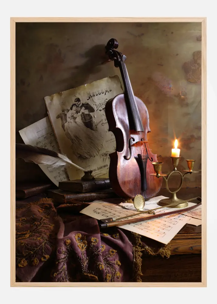 A still life poster of a violin and sheets of music. A soft candle burns brightly illuminating the mahogany colour of the violin as it leans against the wall. A cloth, music sheets, quill, bow and other paraphernalia fill the scene to give a warm, rich feel to the room.