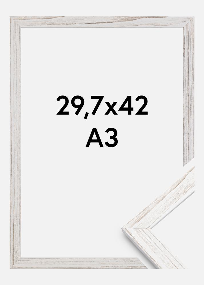 This is a picture frame with vintage design. This white frame has brown veins, giving it a somewhat rustic feel. The frame's edge is 20 mm width and 14 mm deep. This picture frame is made from pine and has real glass. The Vintage White picture frame comes in many different colours that you can match with others. This photo frame measures 29.7x42 cm, and suits A3-sized images.