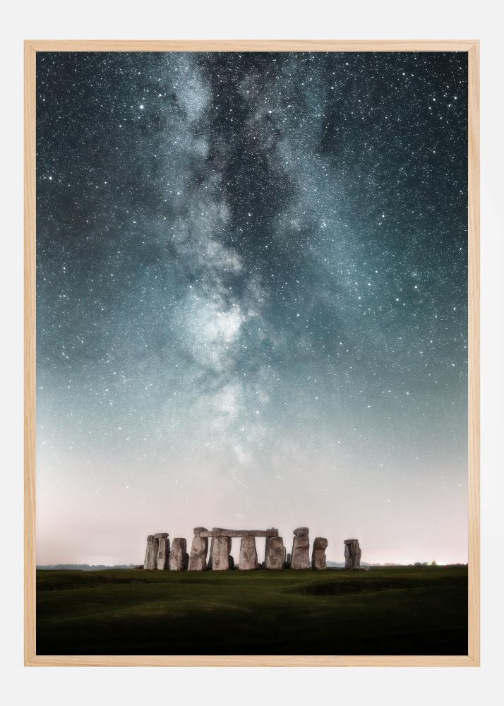 A famous landmark poster of Stonehenge against a dramatic star-studded night sky. This wide shot's focus is the dramatic Milky Way swooping through the rich blue sky filled with stars. Follow the galaxy down until you see Stonehenge as a tiny rock formation at the bottom of the image for a different take on this impressive wonder of the world.