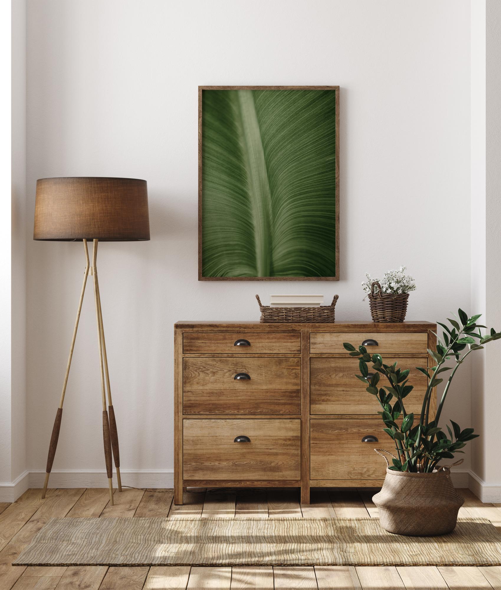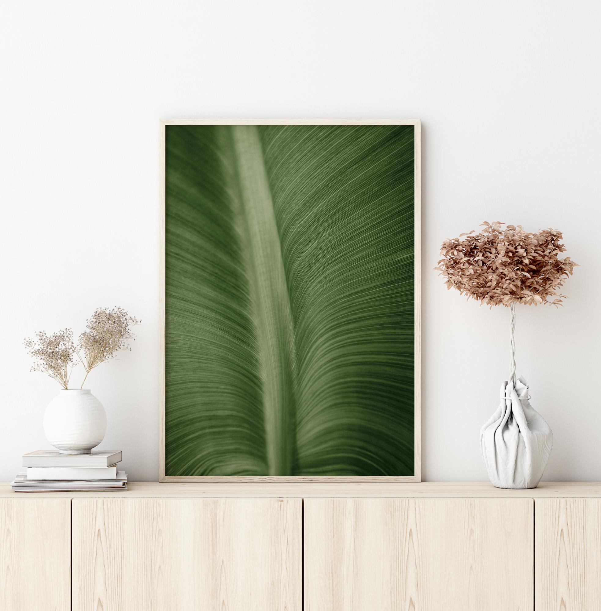 A macro poster of a leaf showing the structure of the veins and rib. Beautiful luscious greens fill this image for a very soothing effect. Thin veins curve gently outward away from the thick strong centre rib of the leaf. Immerse yourself in nature with this close-up.