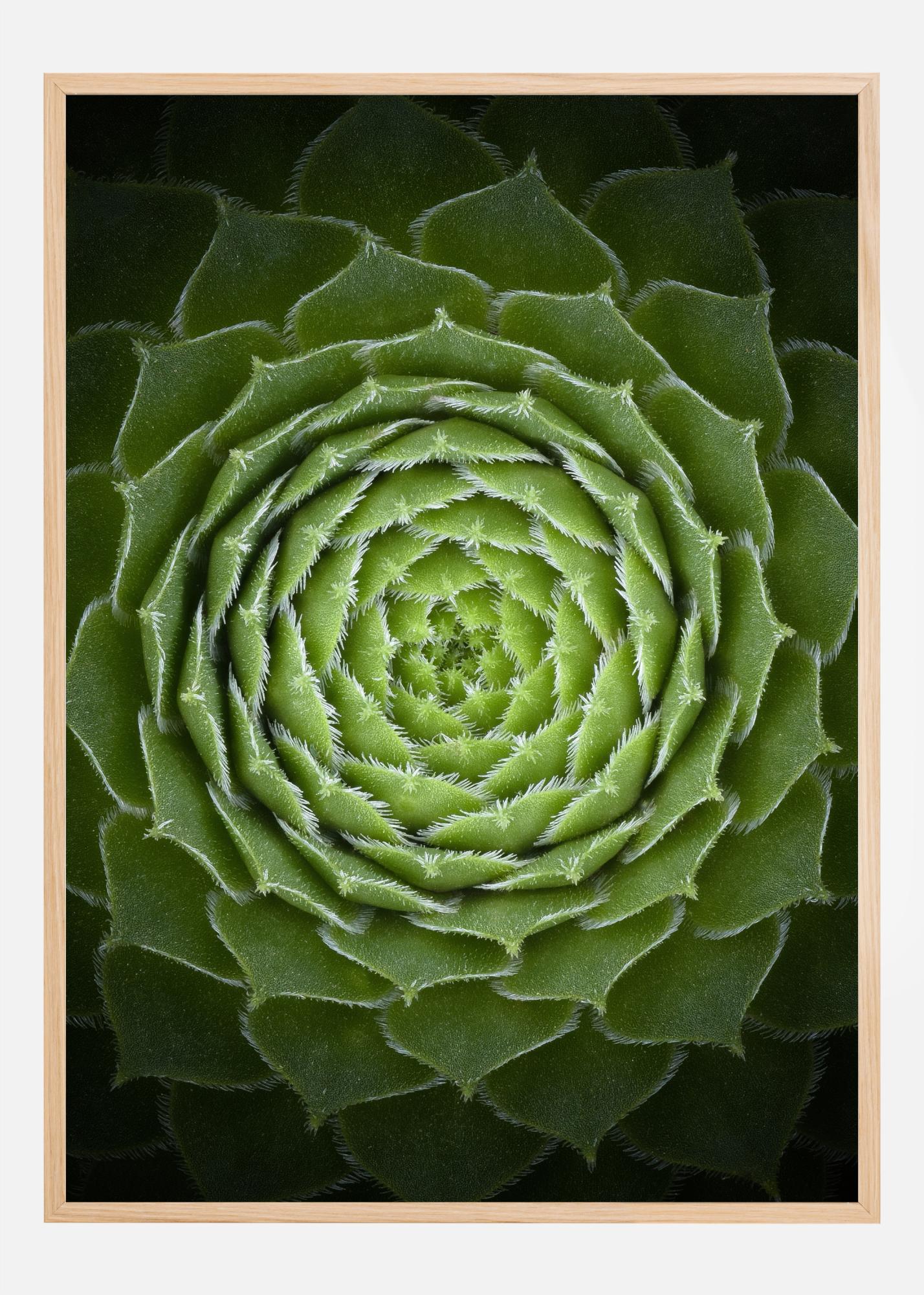 A close-up poster of a succulent. Bright green leaves spiral out in a rose-shaped pattern. The tops of each leaf in the rosette are in sharp detail and tiny white spikes can be seen as you gaze into all the rings of this vibrant green plant.