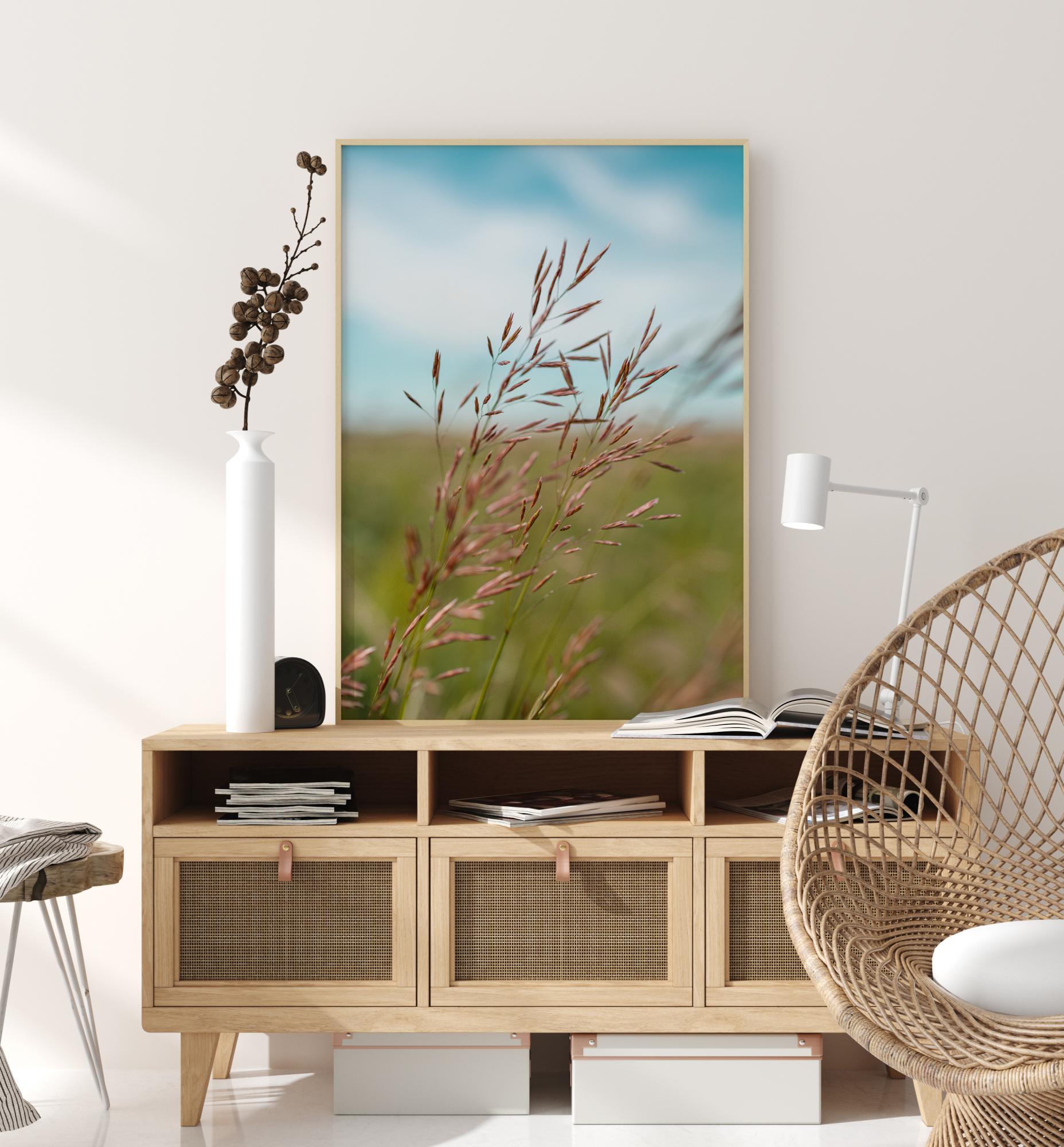 A bright poster of a green field with a close-up of grass seeds on a long stem. The soft pinky red of the grass seed is set off by the bright green field behind. A blue sky with soft white clouds makes this a super summery day. This cheerful scene will brighten any room.