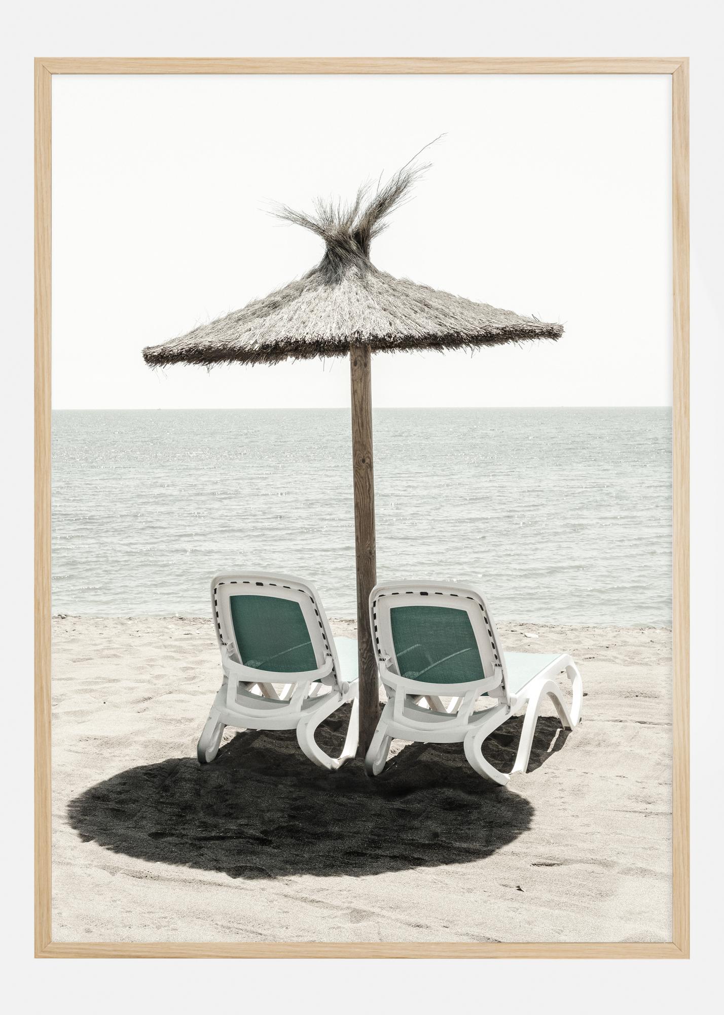 Dream away to the sound of waves and the feeling of sun-warmed sand with this soothing poster. Two empty sun loungers under a straw parasol invite on the beach, with the ocean's horizon in the background. This tranquil scene is an expression of relaxation and an escape from everyday life.