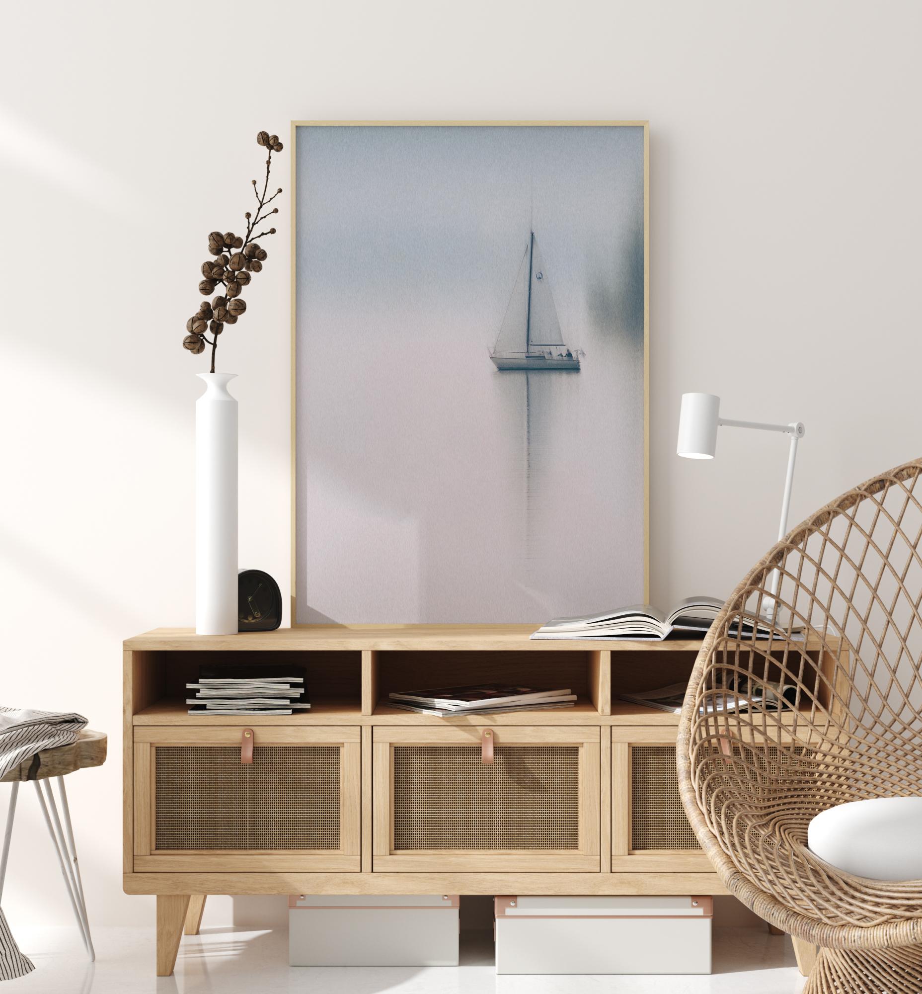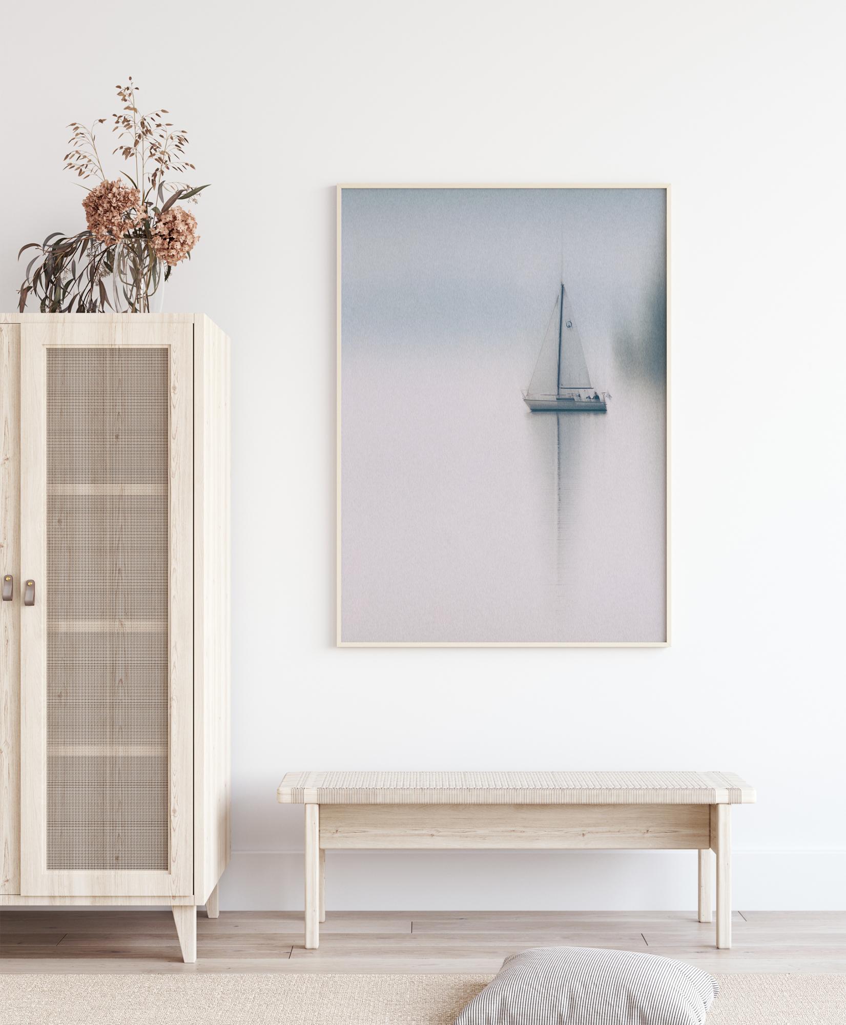 A soothing poster of a yacht in the middle of a pale white lake. The picture is soft with blurred edges to all the images. The sail of the boat is elongated on the water as it glides in the pale blue and grey misty haze of an early Sunday morning.